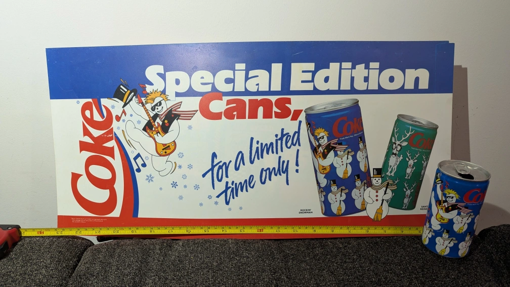 Selling a Coca-Cola special edition can featuring a snowman design with it's an original this plastic ad that was displayed on transit. They are both from 1989. I left the Velcro 3M sticker on the back so you can easily hang it up on your wall.