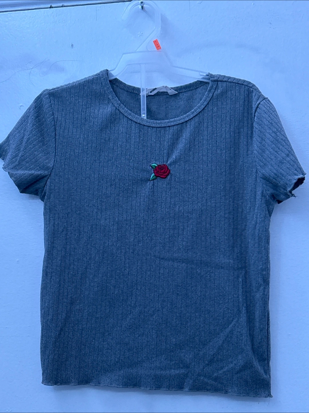• Grey tee with a small rose detail on the front