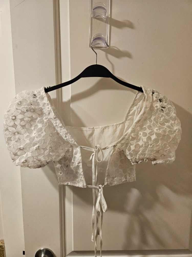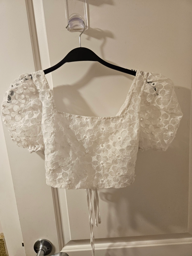 Selling a cute white floral puff sleeve crop top! It's in great condition and perfect for summer. The material is lightweight and breathable, making it super comfy for warm weather. It features a square neckline and tie-back detail. Size is small.