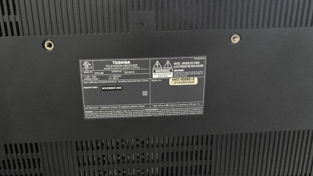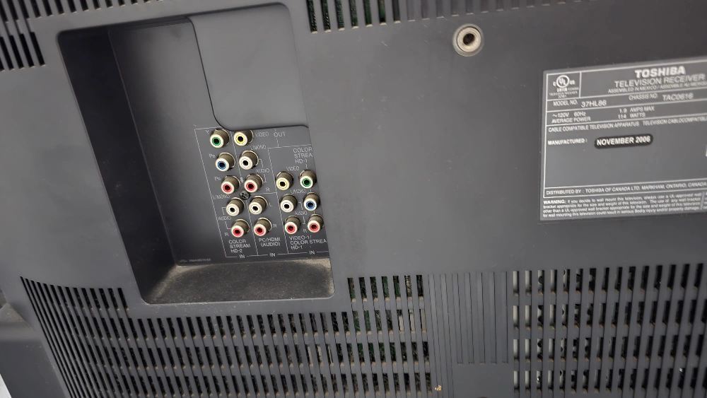 Selling a Toshiba REGZA television. The model number is 37HL86. It has a variety of input options on the back and side, including component, S-video, and RCA audio inputs.