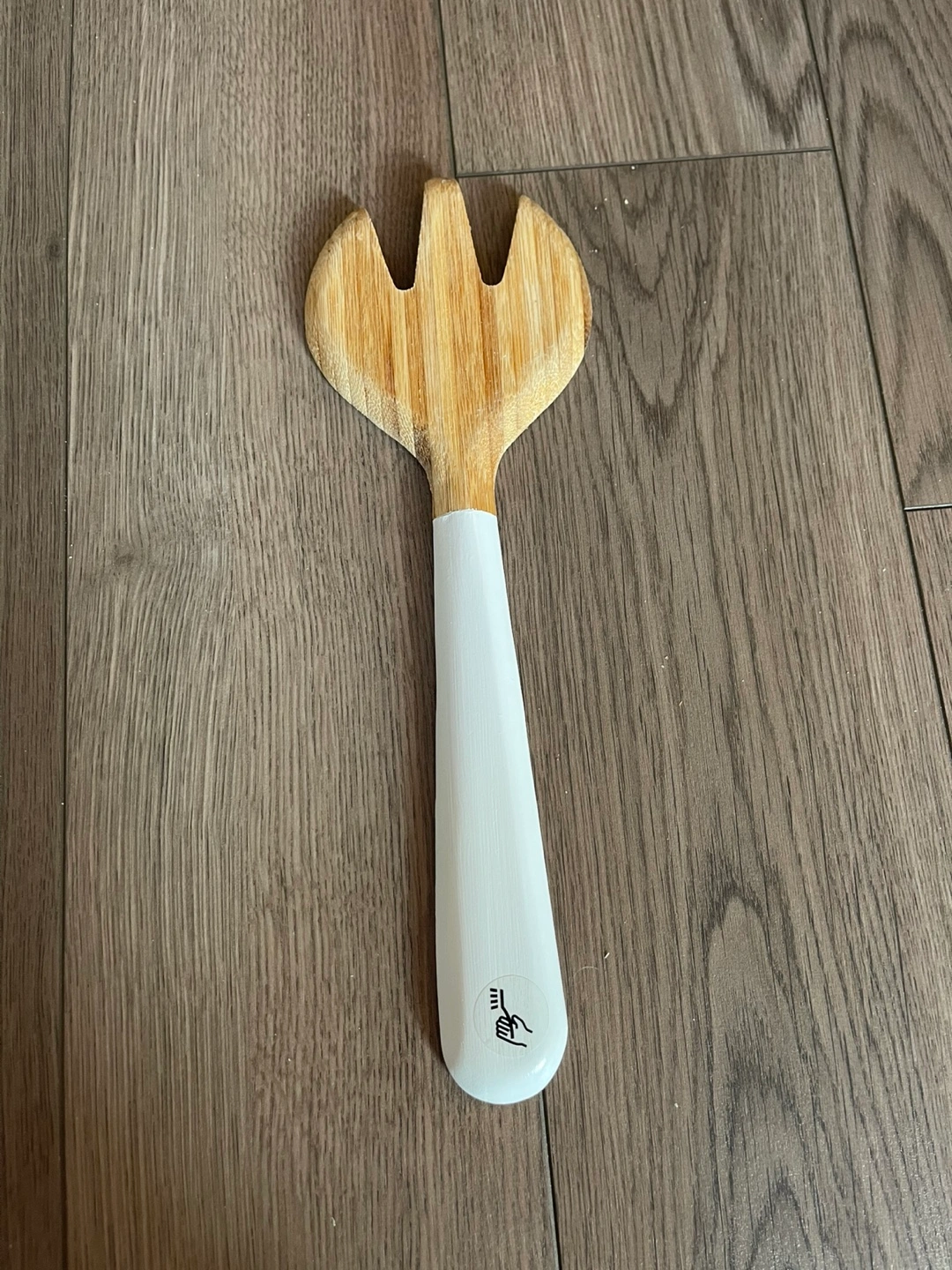 Here's a bamboo salad serving fork with a white handle! It's in great shape and ready to help you toss your favourite salads. Perfect for adding a touch of natural charm to your kitchen or dining table