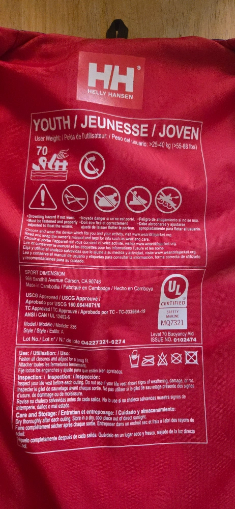 Selling a Helly Hansen youth life jacket. It's in NEW shape never worn! - Designed for youth weighing 55-88 lbs (25-40 kg) - Model/Style: 336