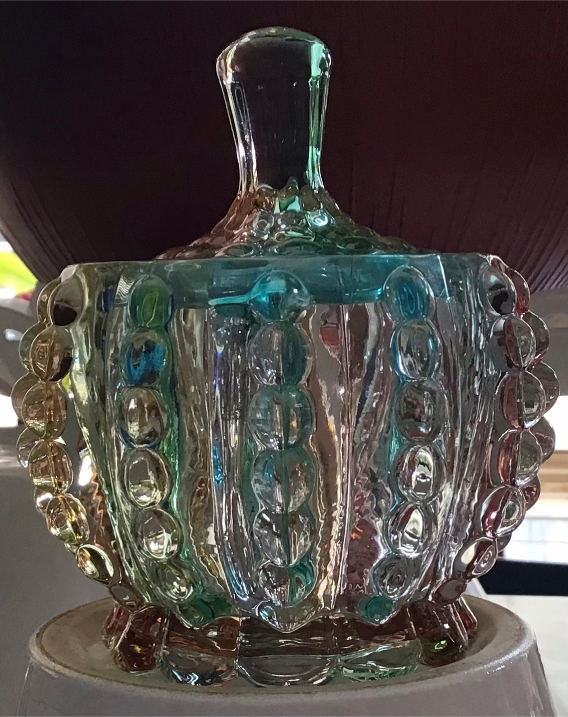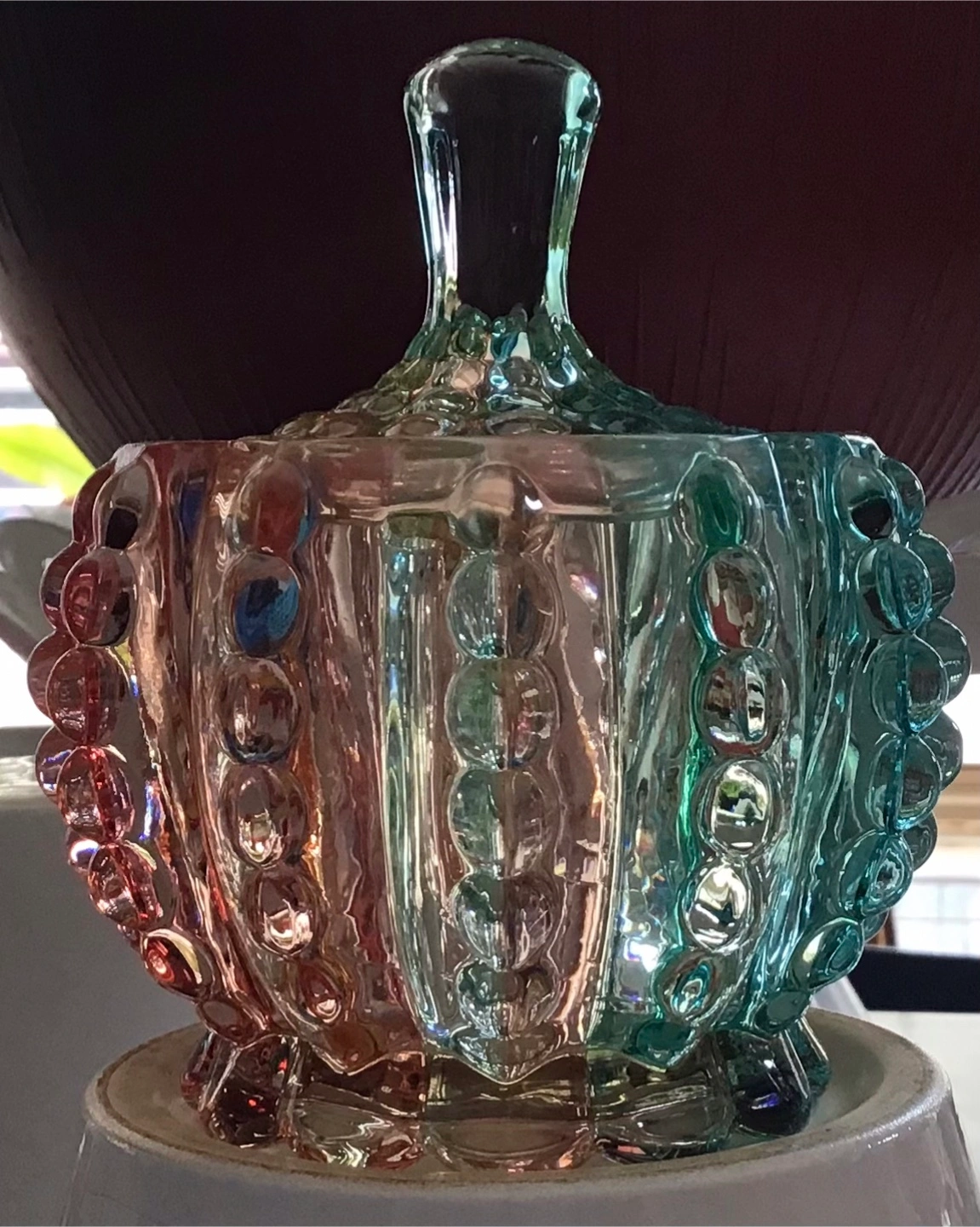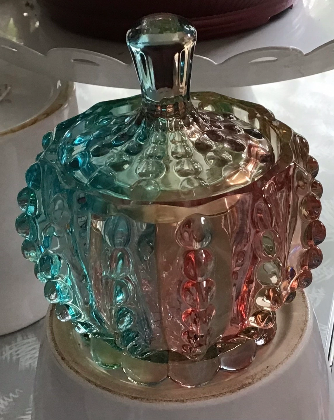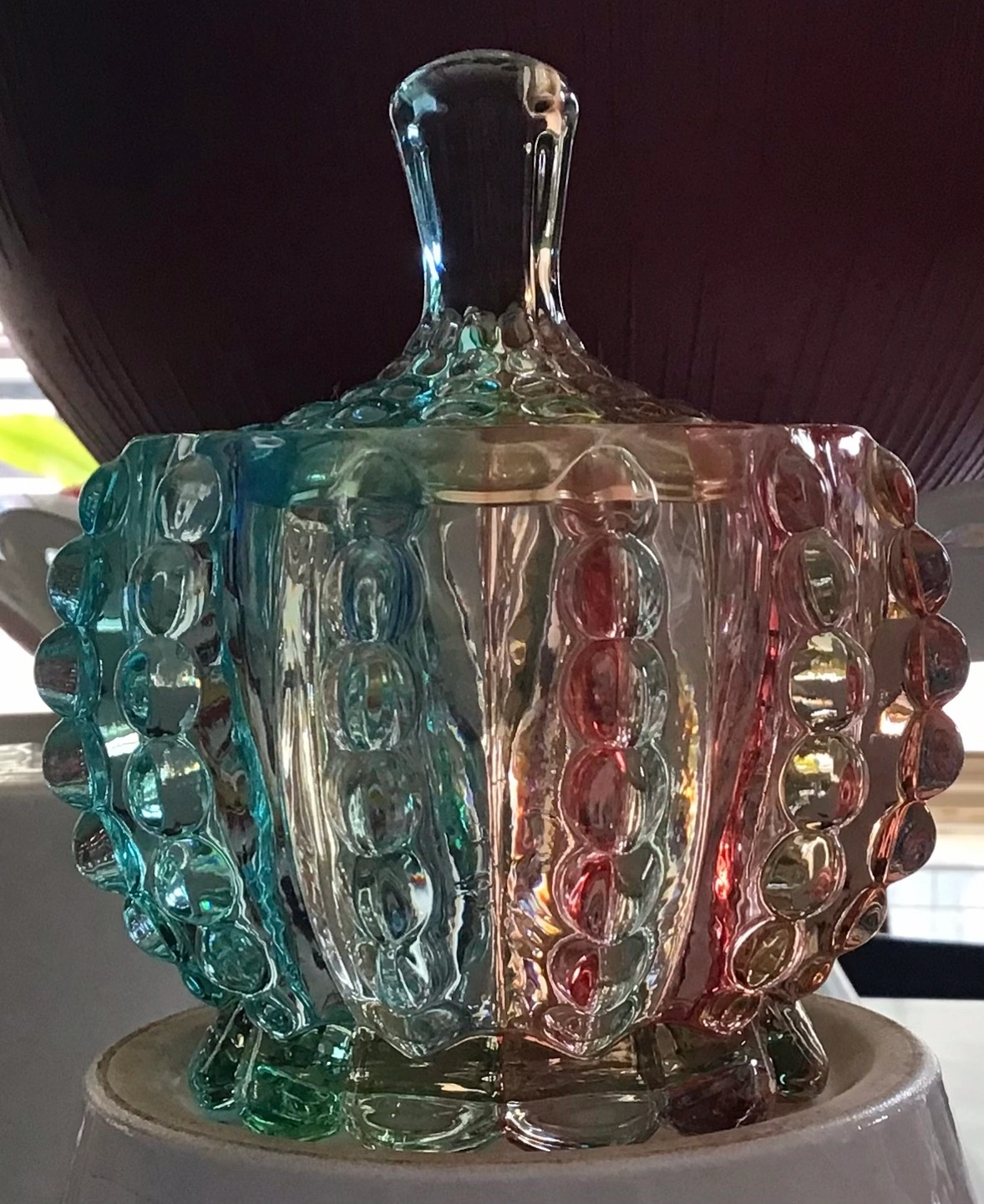 Selling a beautiful vintage glass candy dish. It features a unique rainbow effect with hues of blue, green, and red. The dish has a lovely textured design with a fitted lid. Perfect for adding a touch of vintage charm to your home! 🤩