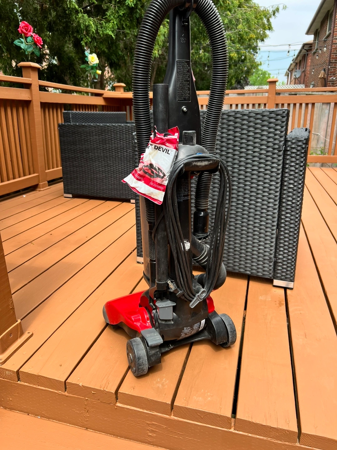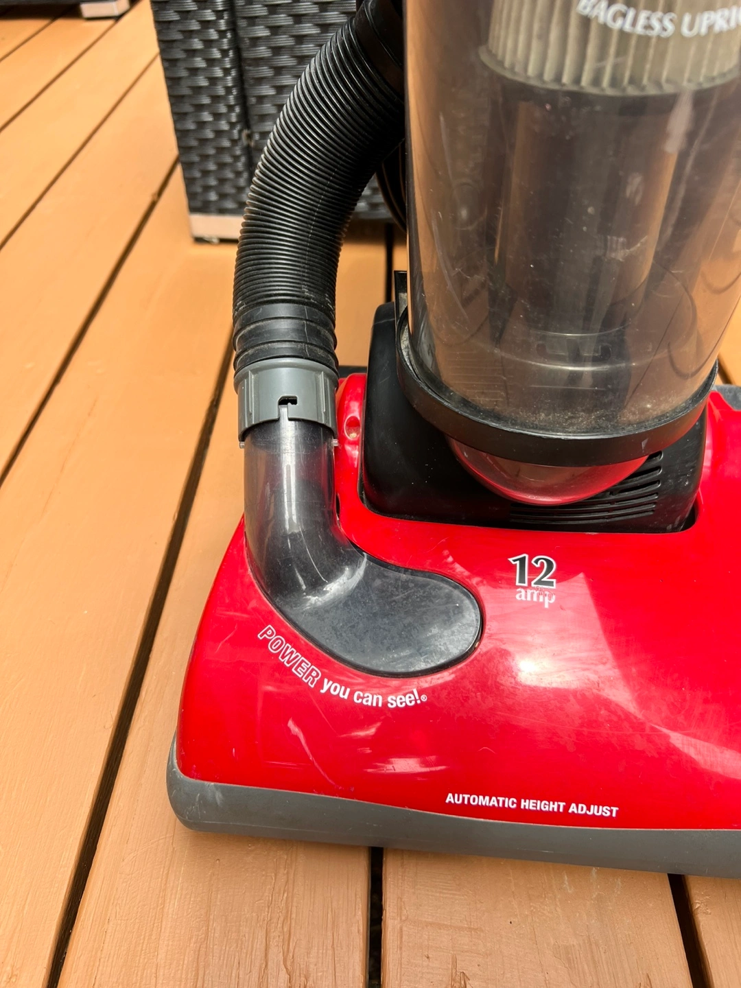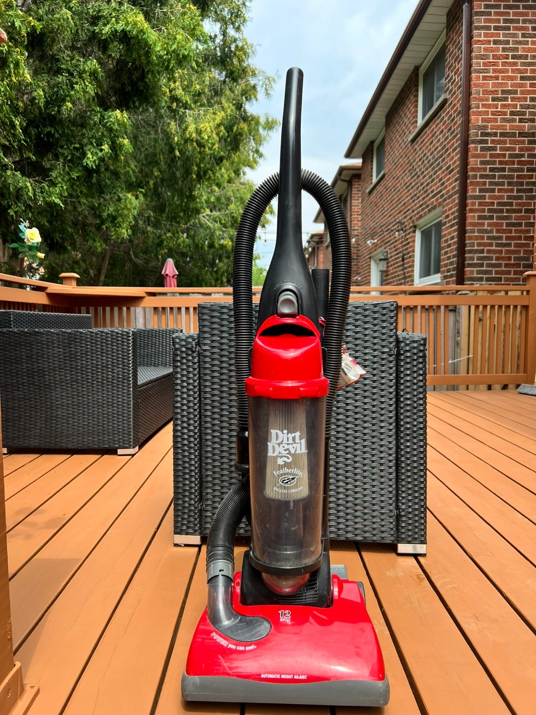 Selling a Dirt Devil Featherlite bagless upright vacuum cleaner. It's red and black and in good working condition. It's 12 amps and has automatic height adjustment. Great for quick cleanups!