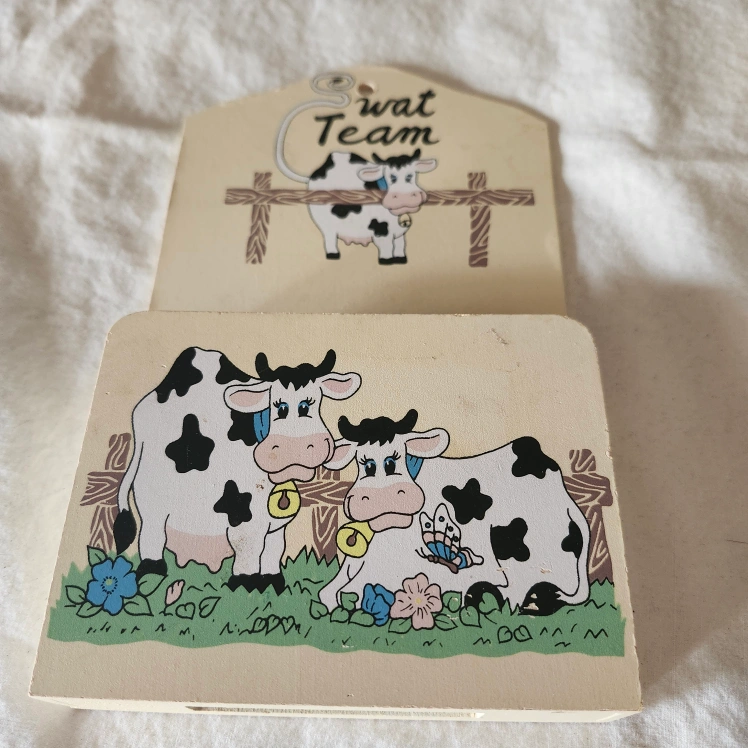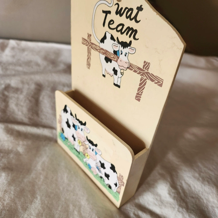 This is a cute wooden paper holder with a cow team design! It's perfect for adding a touch of farm charm to your home decor. It can be used to store mail, letters, cards or other small items. Pick Up
