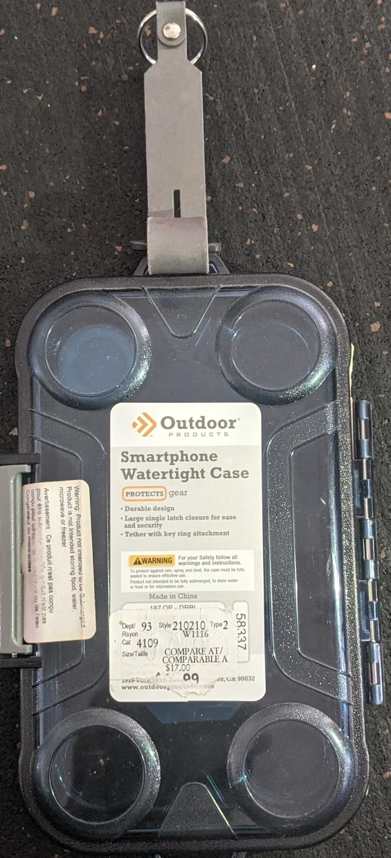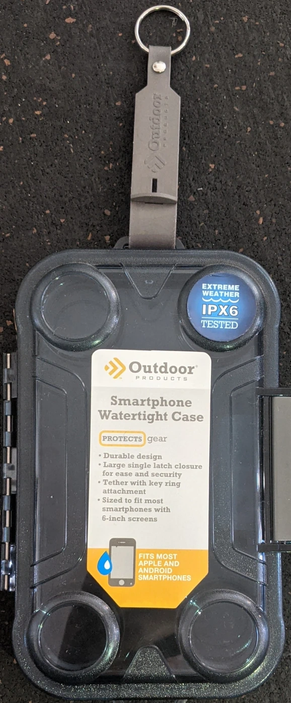 Staying connected has become more and more necessary in our technological world. Protect your smartphone with the Outdoor Products Cell Phone Dry box. Its waterproof design keeps out dirt, sand and moisture so you can stay connected while working at a job site, floating down a river or camping. Made from shatterproof polycarbonate material, this case features an O-ring closure that ensures a watertight seal, easy open latch, and a woven sport leash with swivel clip conveniently secures the case to a backpack, belt loop or PFD.