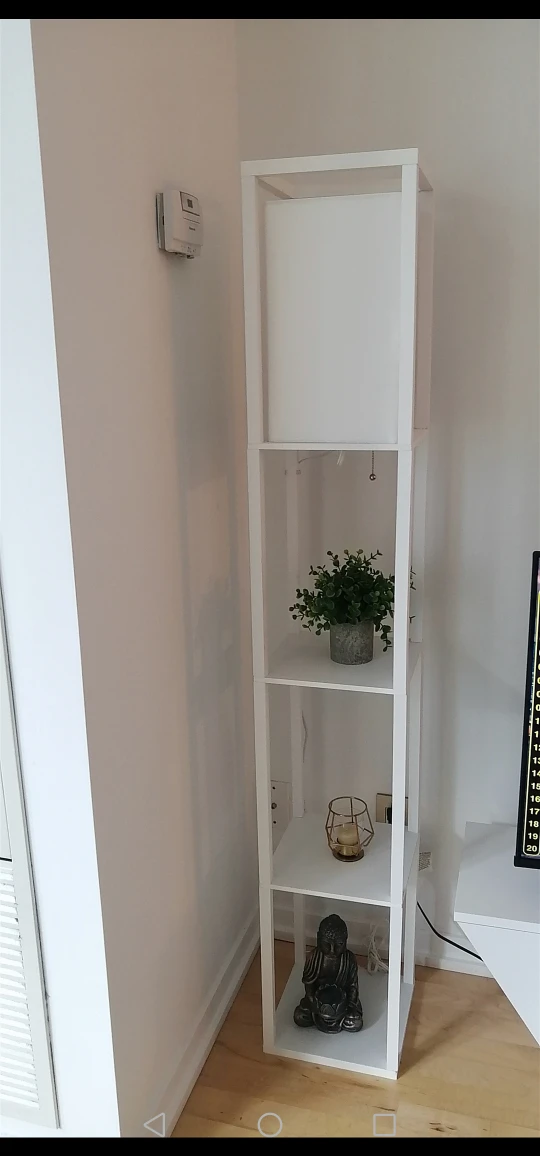 Selling a white standing shelf lamp. It's a great addition to any room. It features three shelves to display your favourite items and a lamp at the top to provide light. Perfect for a living room or bedroom!