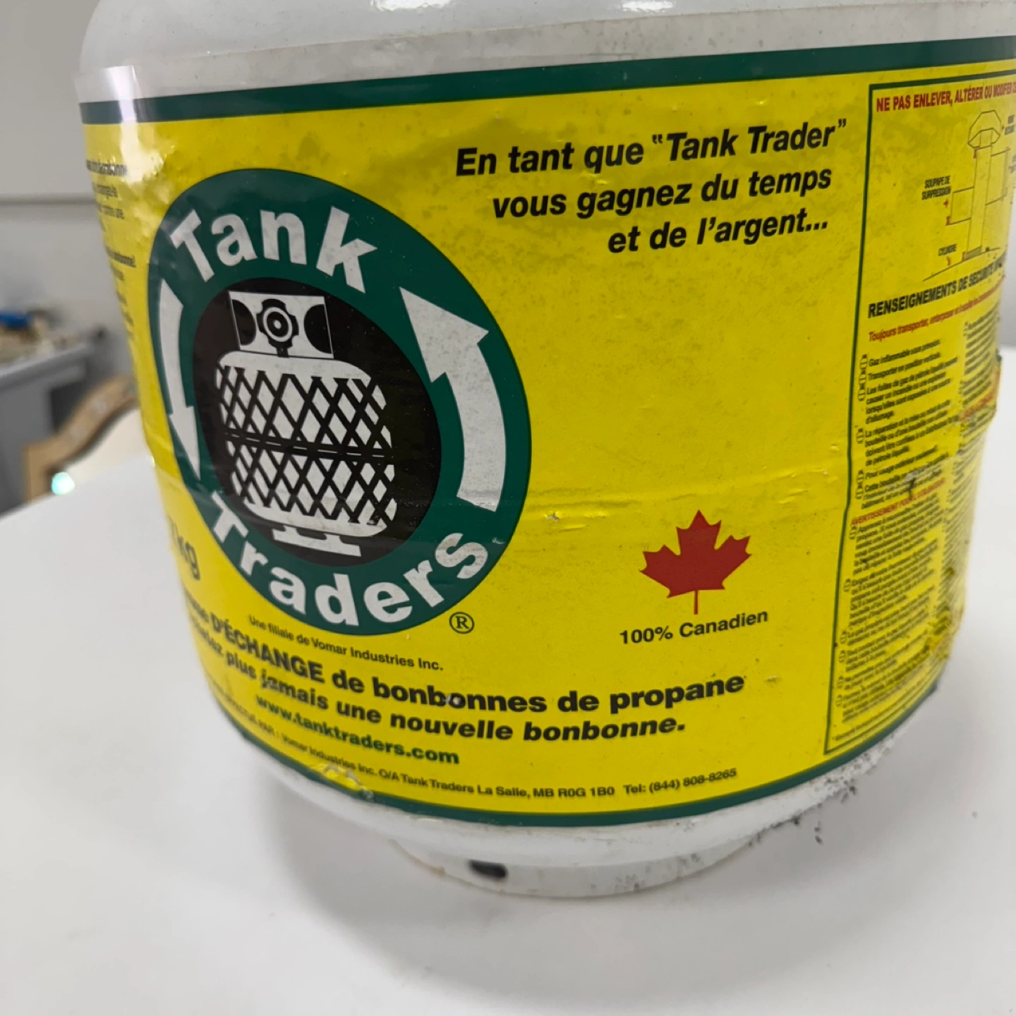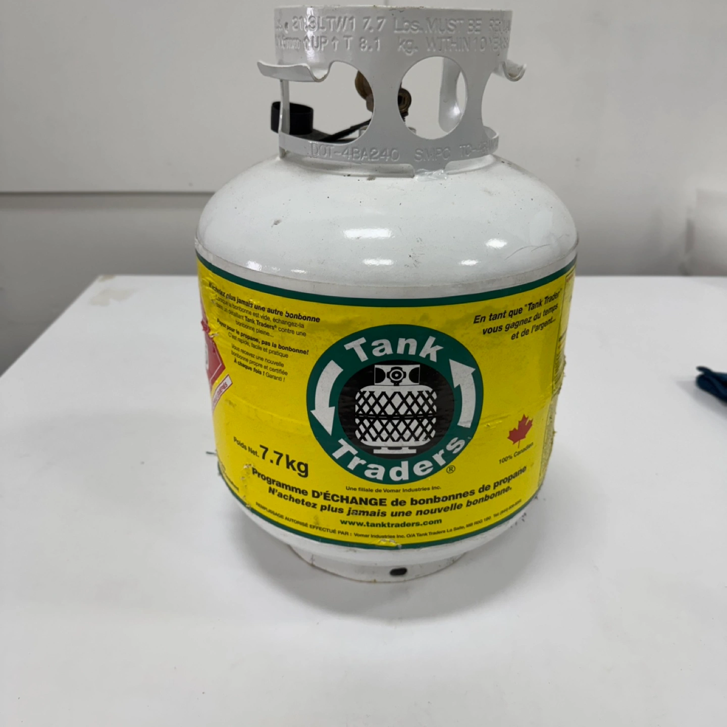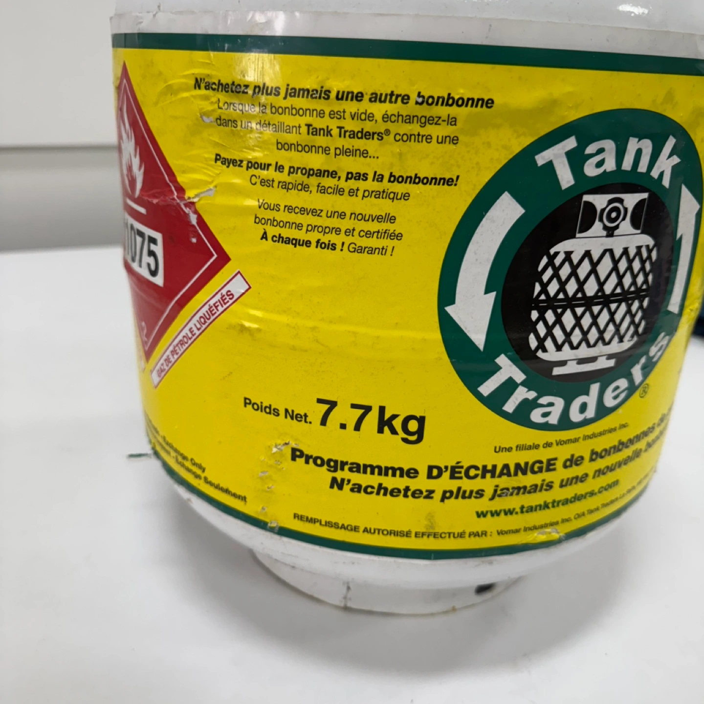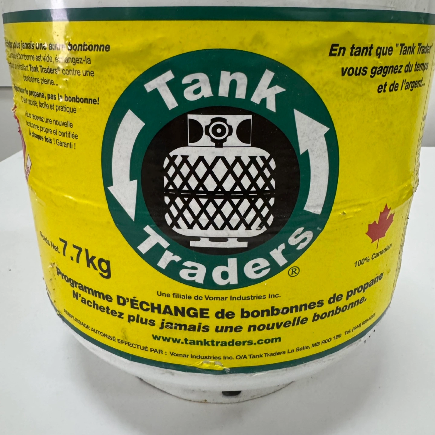 93Used empty propane tank – 7.7 kg (standard BBQ size). • Brand: Tank Traders • Exchangeable at participating stores for a full tank • Great for BBQs, heaters, and camping