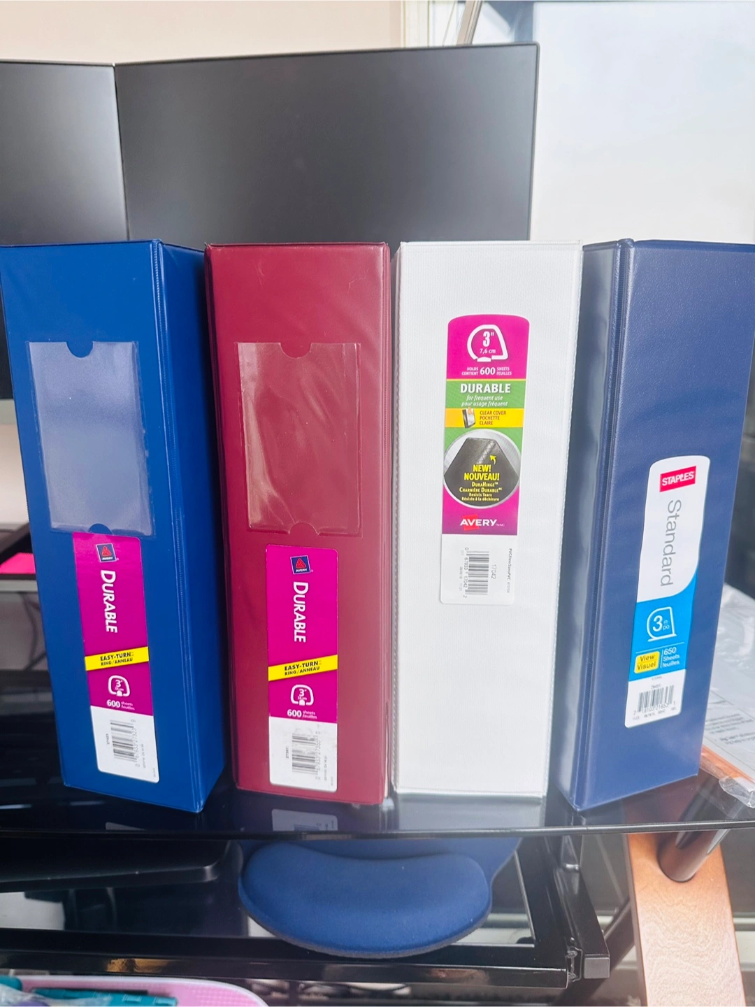 Giving away a set of four 3-inch binders! There's one Staples brand binder and three Avery brand binders. They are durable and easy to use and each can hold up to 600 sheets of paper. Great for keeping your documents organized!