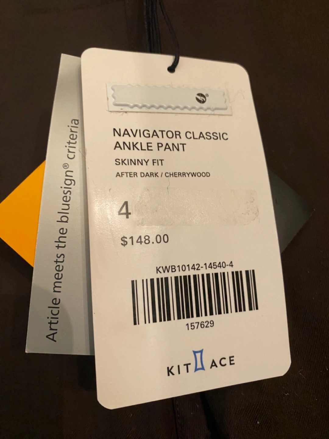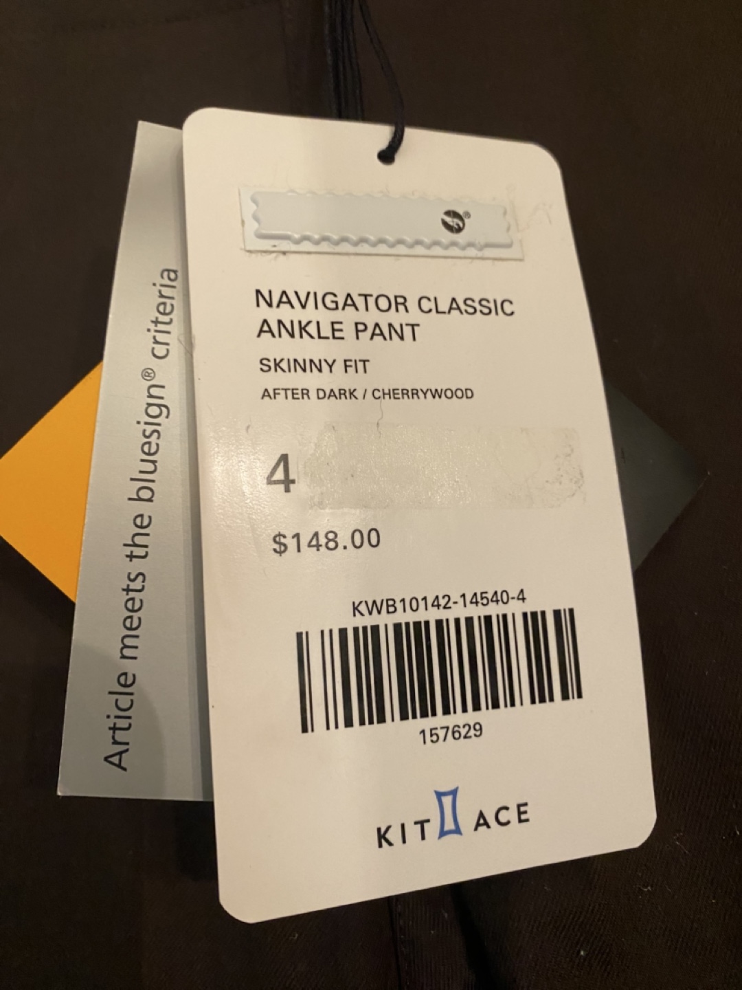 1. a pair of Kit and Ace Navigator Classic Ankle Pants in size 4. The colour is "After Dark / Cherrywood". They have a skinny fit and were originally bought for $148. Article meets the bluesign criteria BNWT. Perfect for biking and wearing to work.