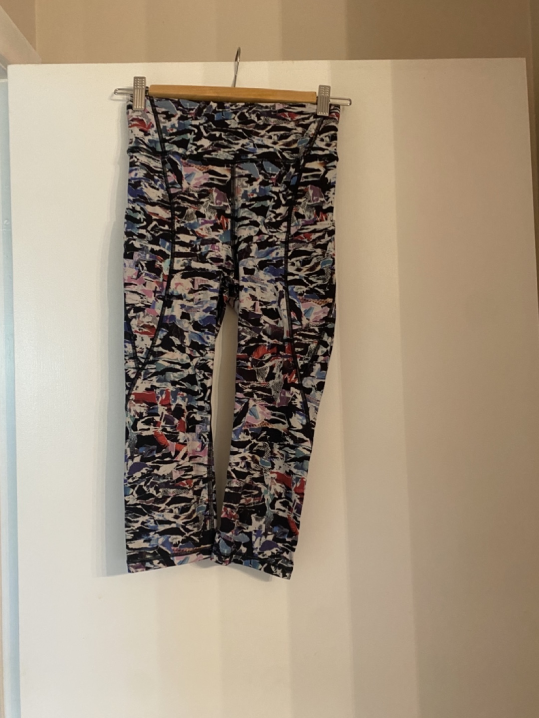 3 Lululemon high waisted mosaic capris pants with side pockets large enough for a cellphone. Perfect for any type of work out and just to wear around day to day. Size 4