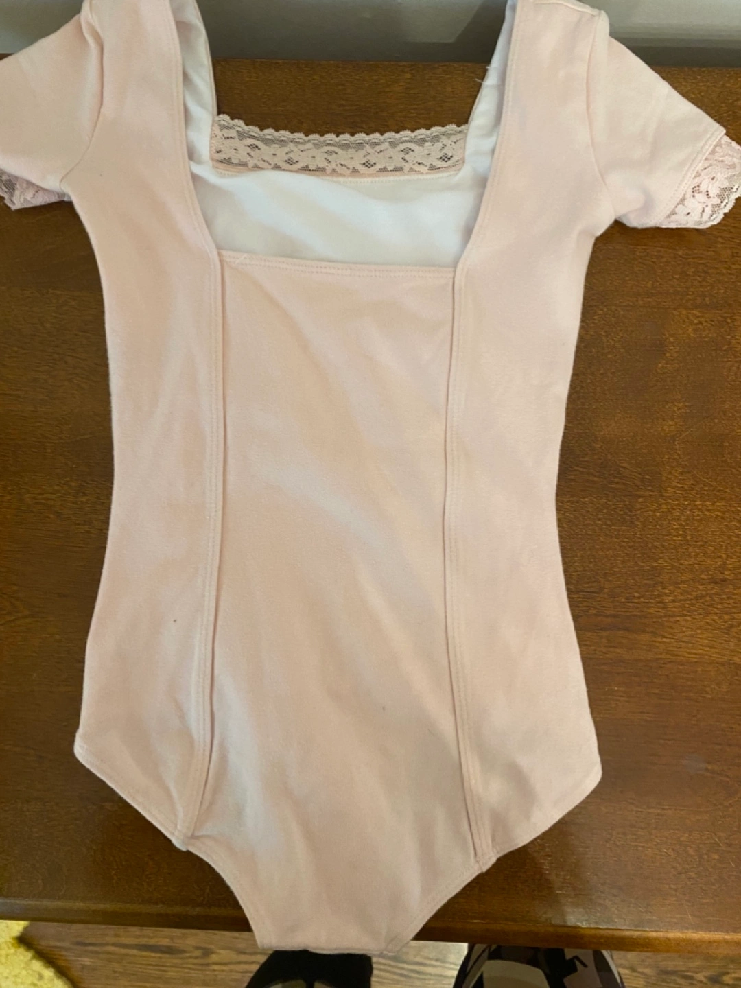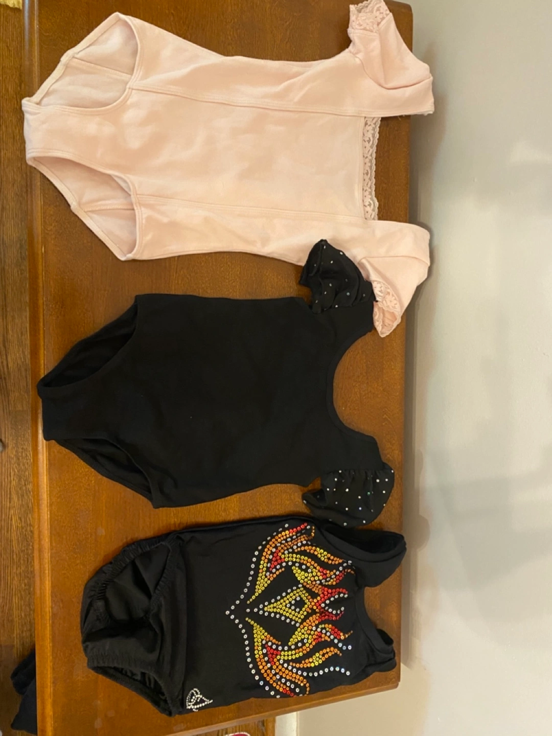 Selling a set of leotards! There's one in a light pink with lace detailing, and two black leotards, one with bow and polka dot sleeve details and one with a rhinestone design. The 2 black are smaller fitting a size small 5/6 and the pick is a little larger fitting a size medium fitting 7/8.