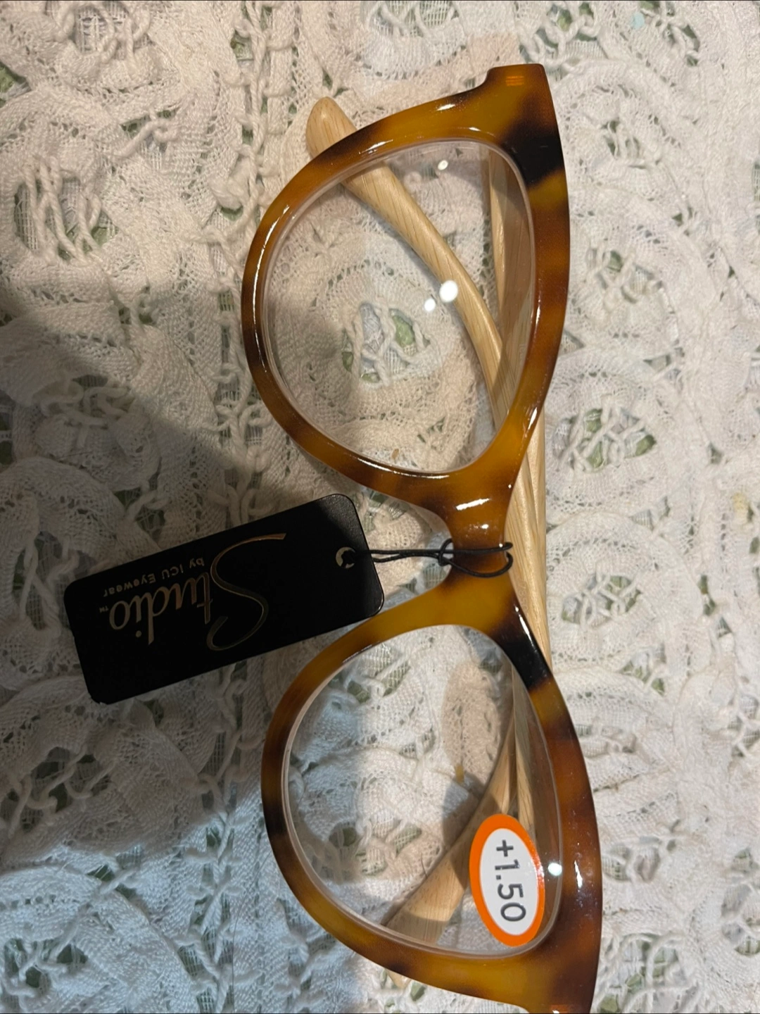 Studio by ICU Eyewear reading glasses, with a magnification of +1.50. These glasses feature a stylish tortoiseshell frame , banboo sides and are absolutely new . Perfect for anyone needing a little extra help with their reading!