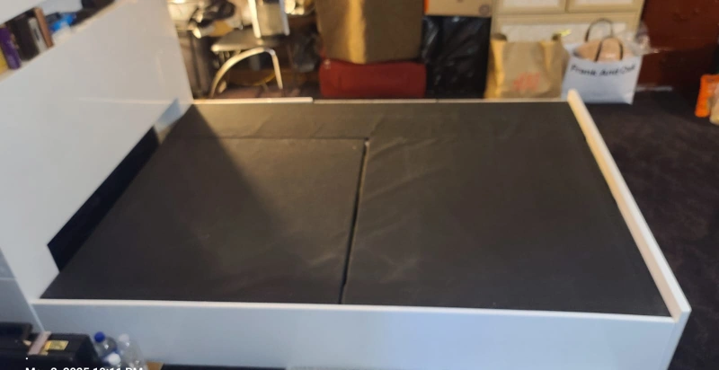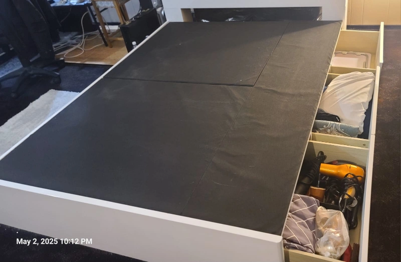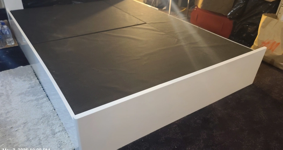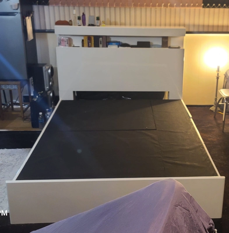 Selling a white queen size bed frame. It features built-in storage drawers, perfect for maximizing space in your bedroom. Great for storing extra bedding, clothes, or other items. The bed frame is in good condition and ready for a new home!