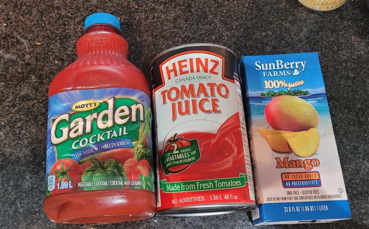 Heinz Tomato Juice expires August 25/2025 SunBerry Farms Mango Juice. expires Jul 14/2026