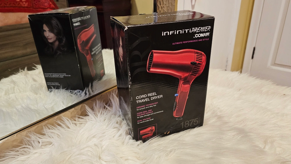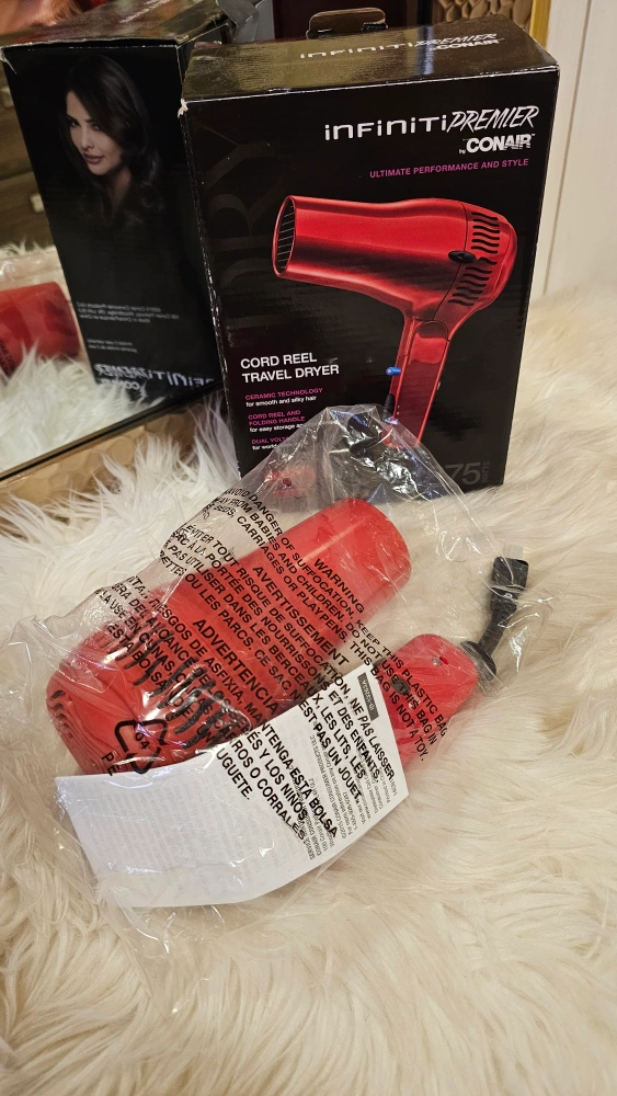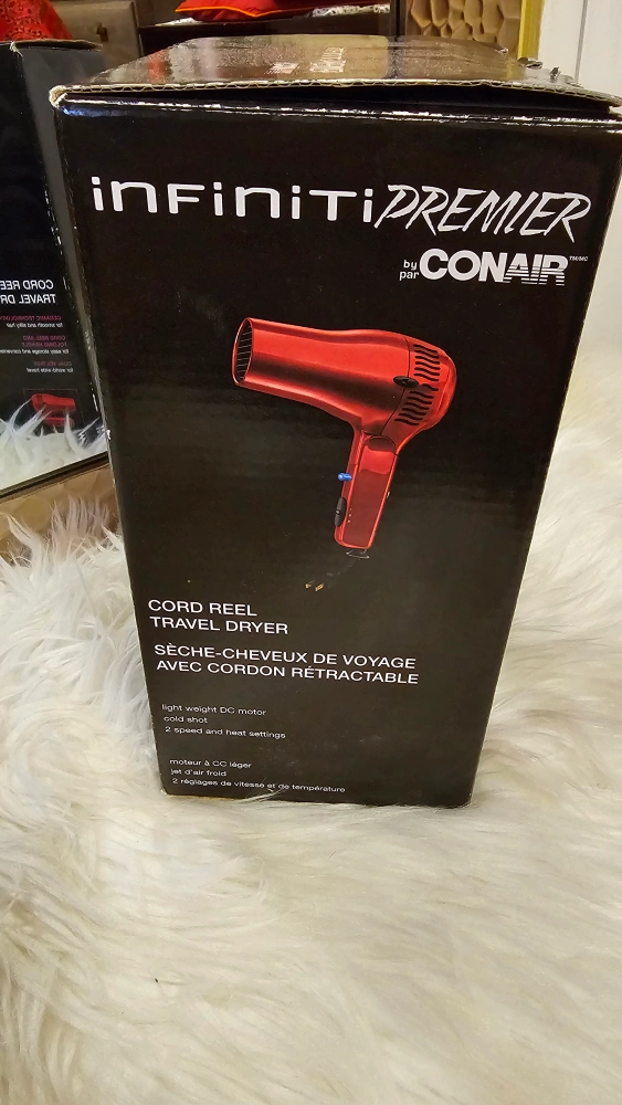 Selling a brand new Conair Infiniti Premier travel hair dryer in red! It's a cord reel travel dryer. It's great for smooth and silky hair. The cord reel makes it easy for storage and convenience. It also has dual voltage for worldwide travel! Comes with the box and instruction manual.