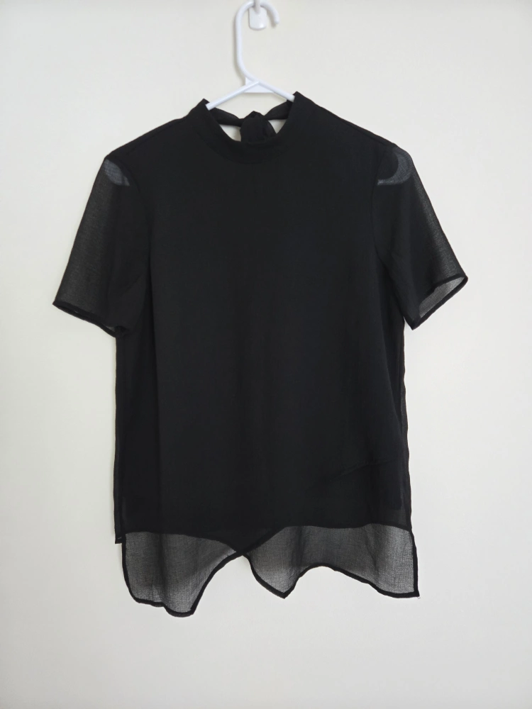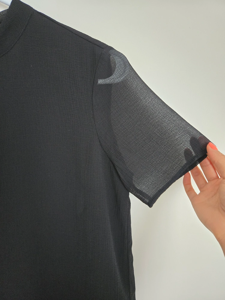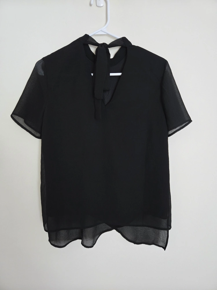 Stylish black top with black undershirt and sheer overlay from Vero Moda! It also features a beautiful view neck with tie at the back. It's a size small. Perfect for dressing up or down, this top is a versatile addition to any wardrobe