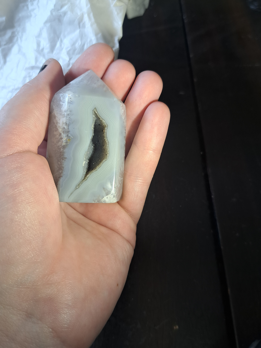 Selling a beautiful agate tower crystal. It has a unique pattern and is in great condition. Perfect for any crystal collection!