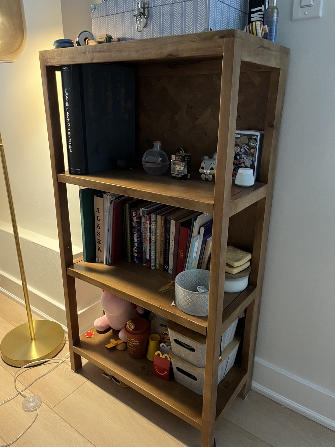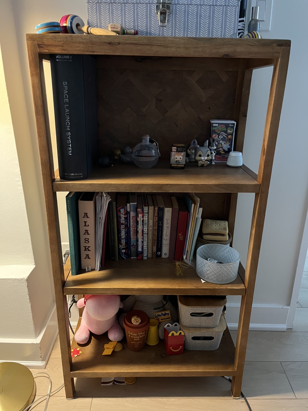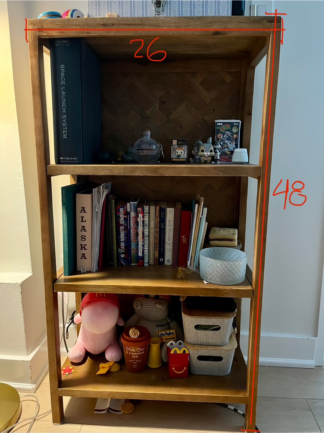 Selling a wooden bookshelf. It's in great shape and ready for a new home! The dimensions are 26 inches wide and 48 inches tall. Perfect for books, decor, or anything else you need to display