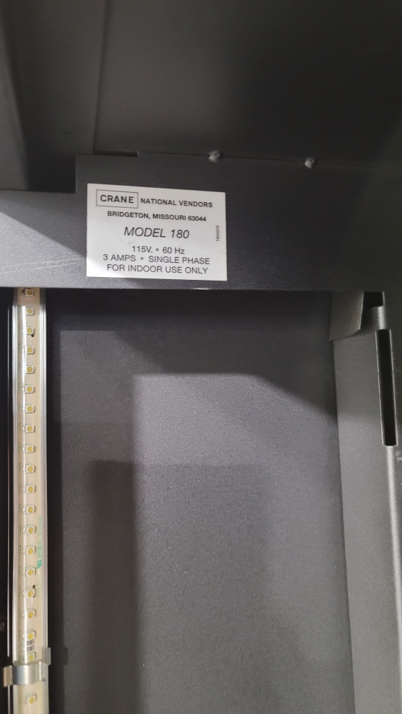 Selling a Crane National Vendors Model 180 vending machine. It's in good working condition and ready to be stocked with your favorite snacks and drinks. Perfect for a small business or community space!