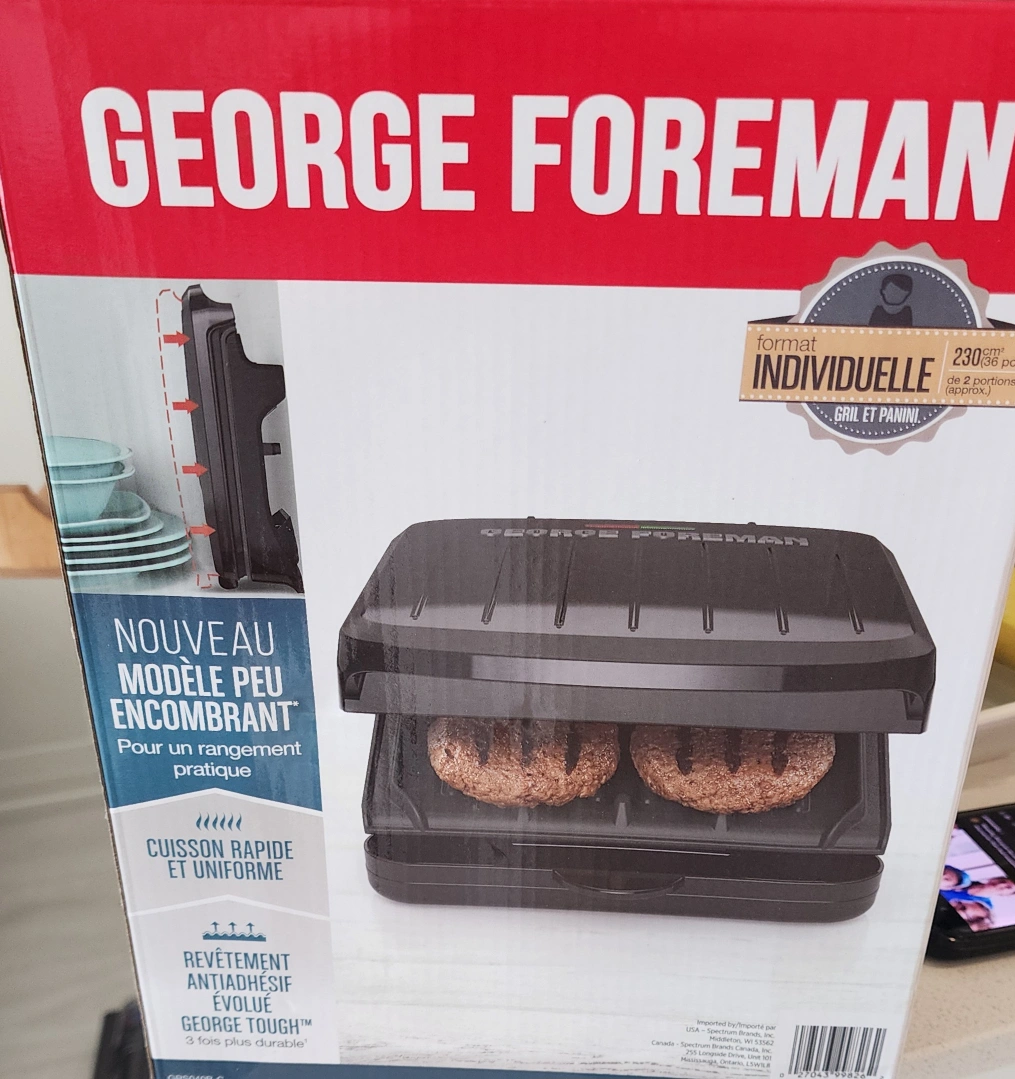 71Selling a George Foreman grill in its original box. It's a new model designed to be compact for easy storage. Features include quick and even cooking, and an evolved non-stick coating called George Tough, which is 3 times more durable