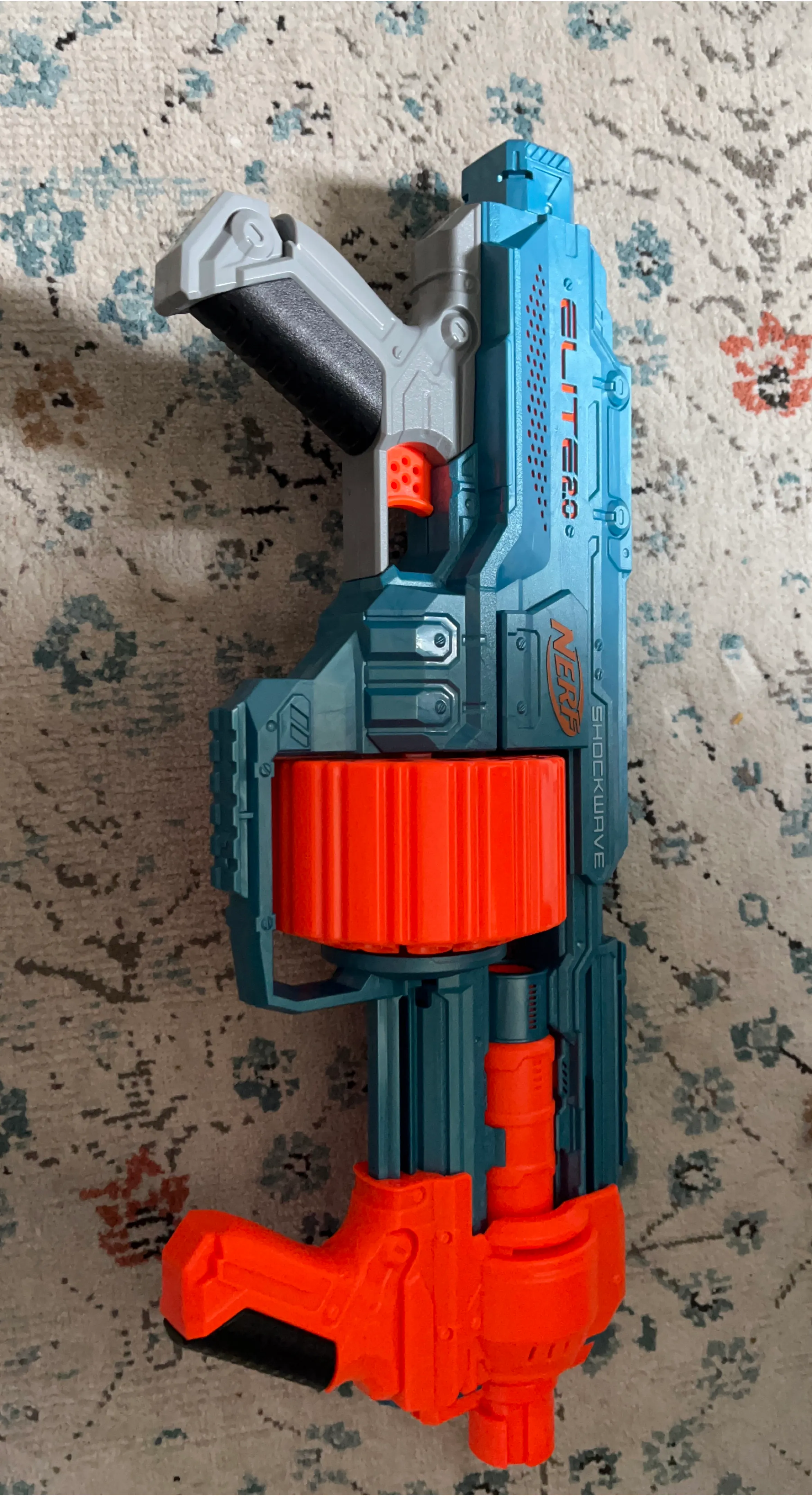 Selling a Nerf Elite 2.0 Shockwave RD-15 blaster! It's in great shape and ready for some action. The blaster features a rotating drum that holds 15 darts, so you can fire a bunch before reloading. The colors are blue, orange, and grey. Have fun!