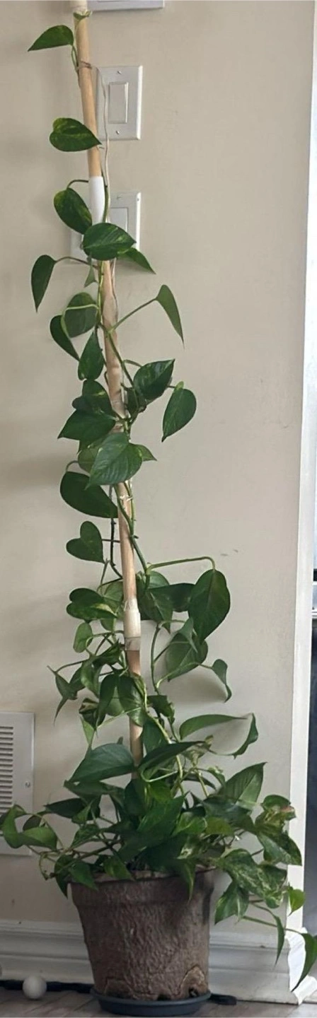 Selling a healthy golden pothos plant! It's got a nice support structure to help it grow upwards. The plant is well-established in its pot and ready to brighten up your space