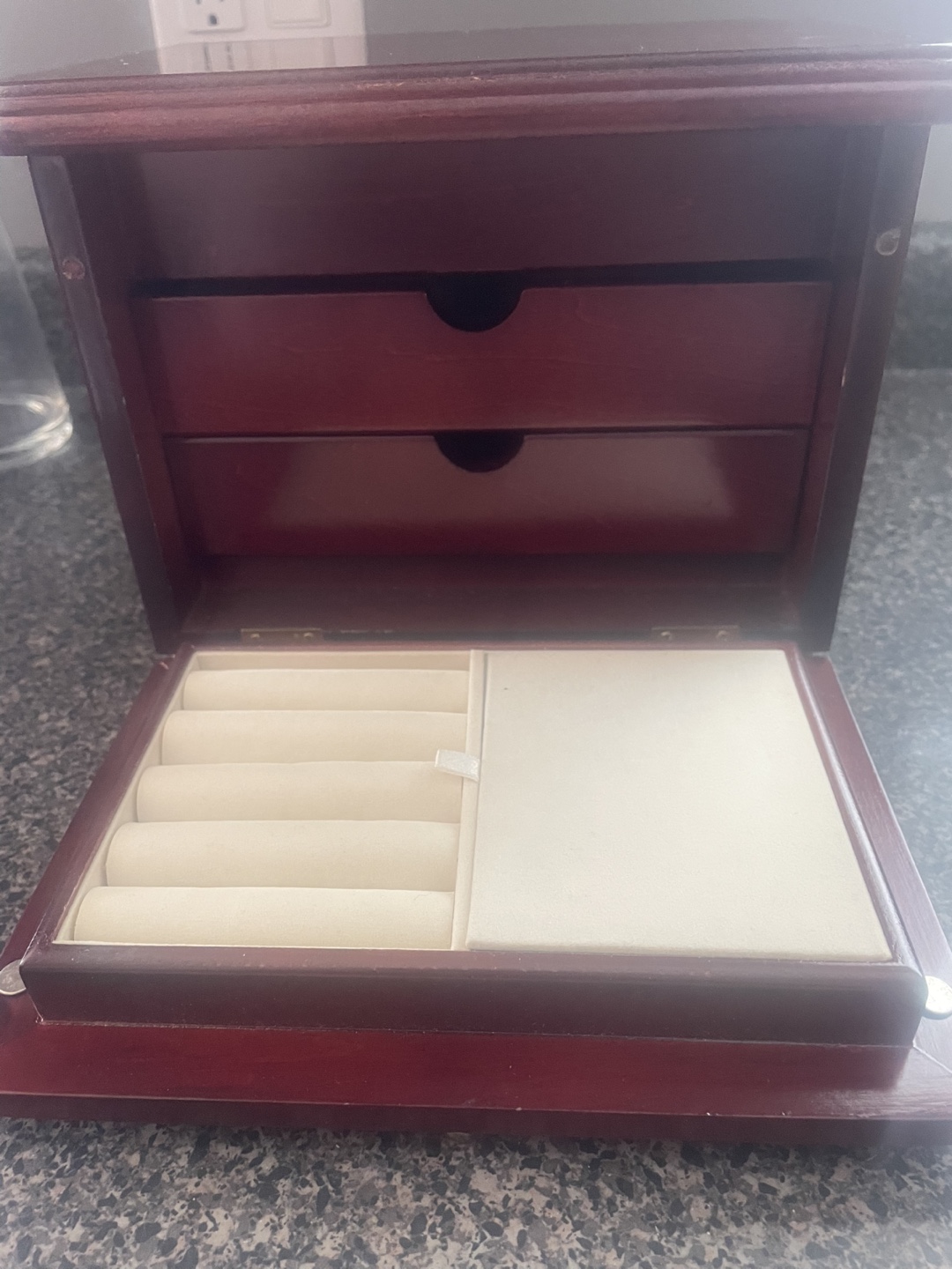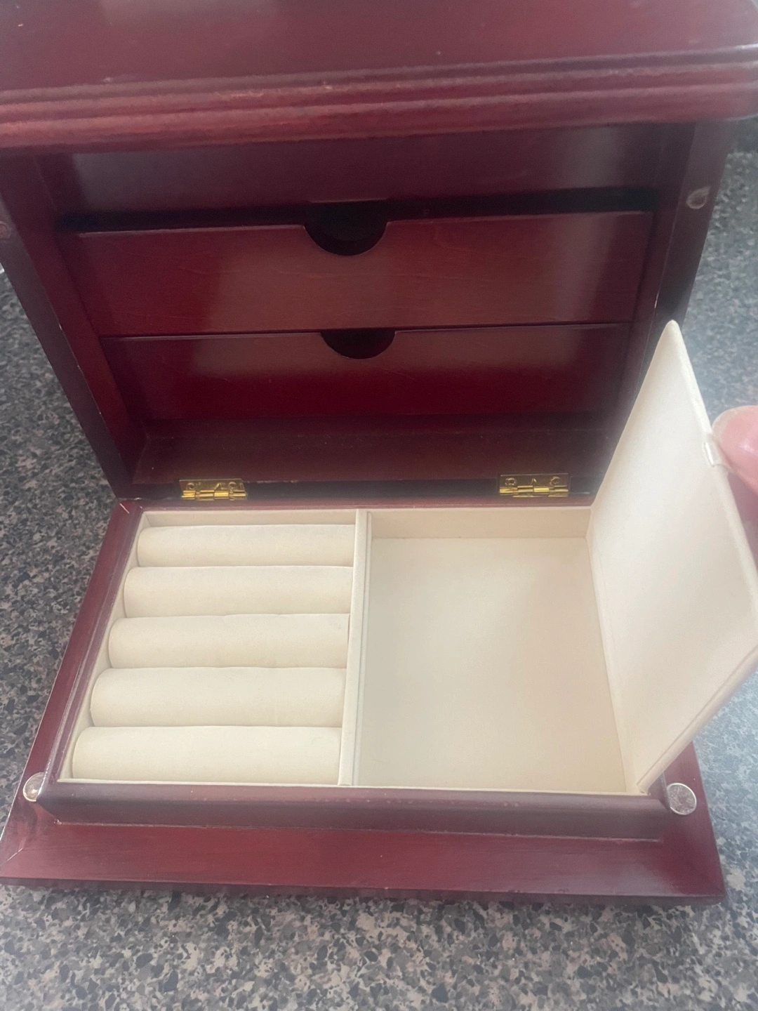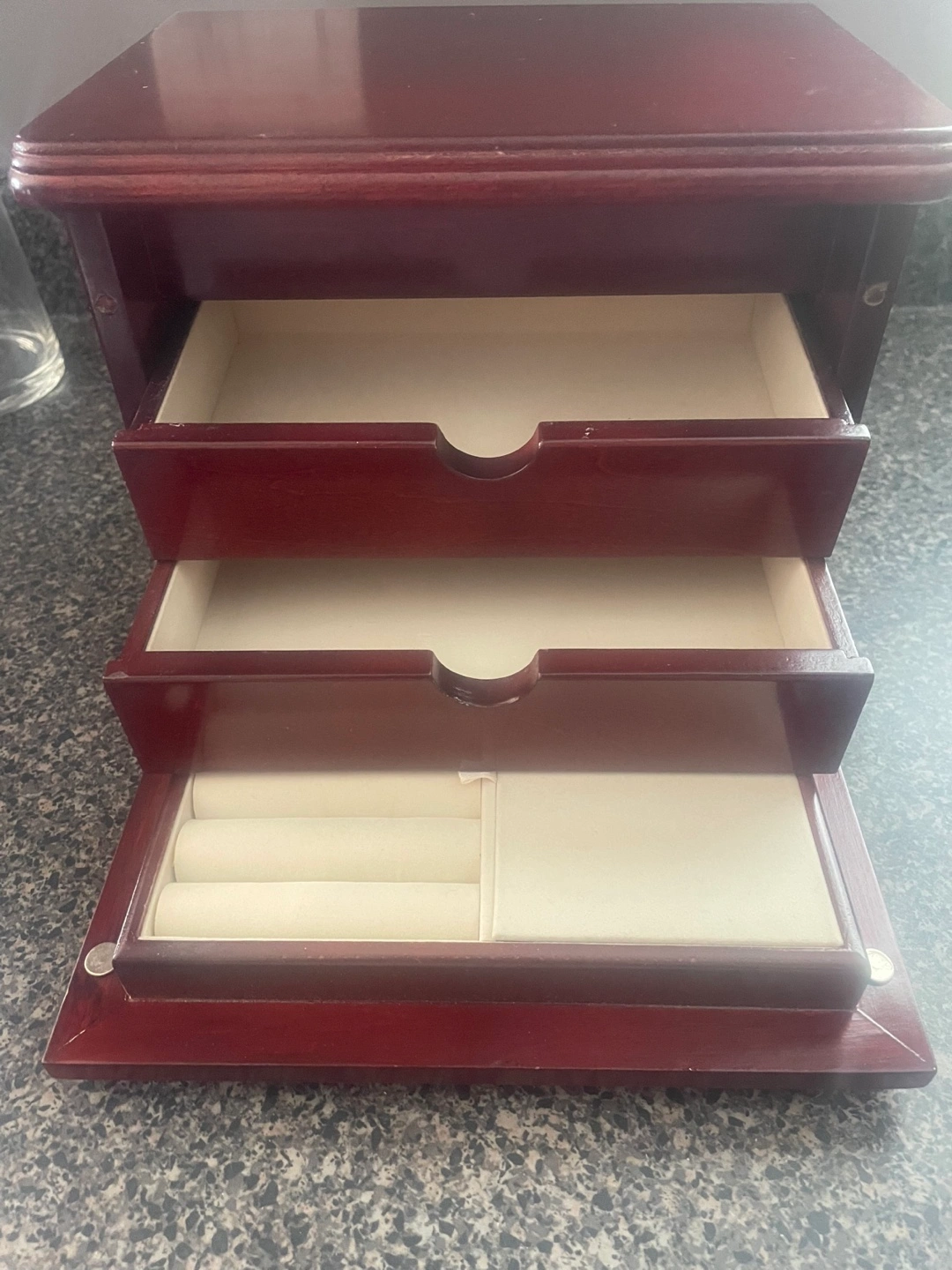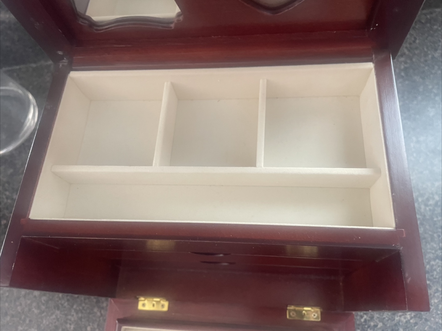 Here's a lovely wooden jewellery box! It has multiple drawers and compartments, perfect for organizing your rings, necklaces, and other treasures. The box is in great shape and has a beautiful floral design on the front. It also has small metal feet.