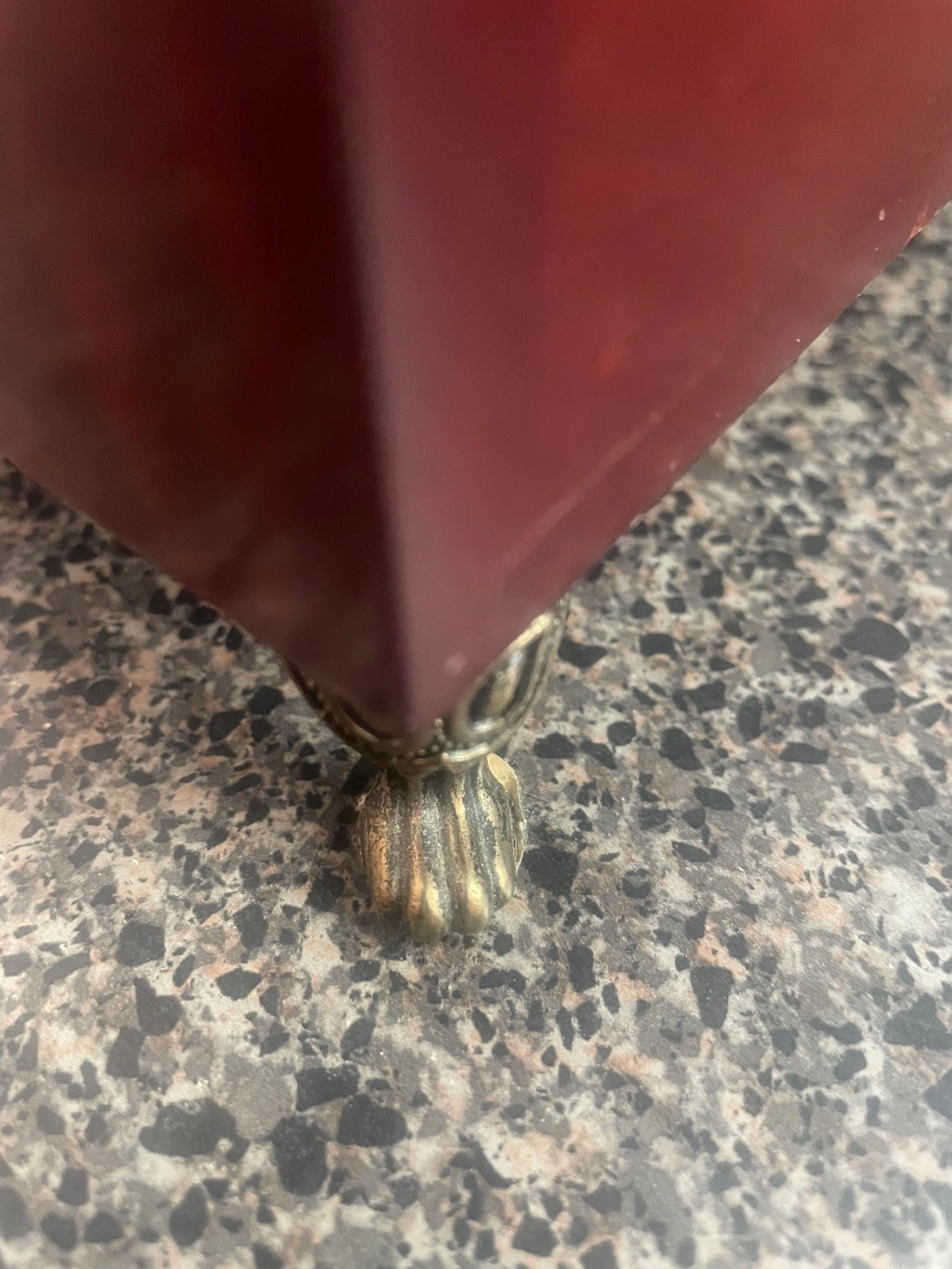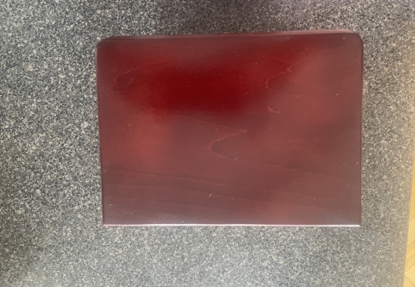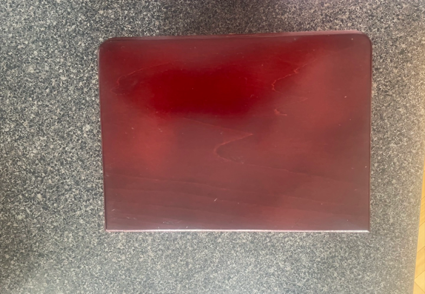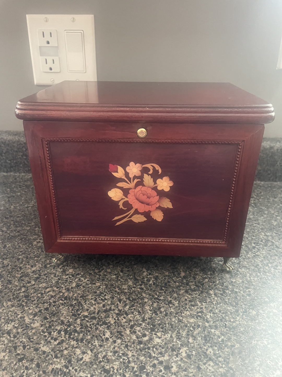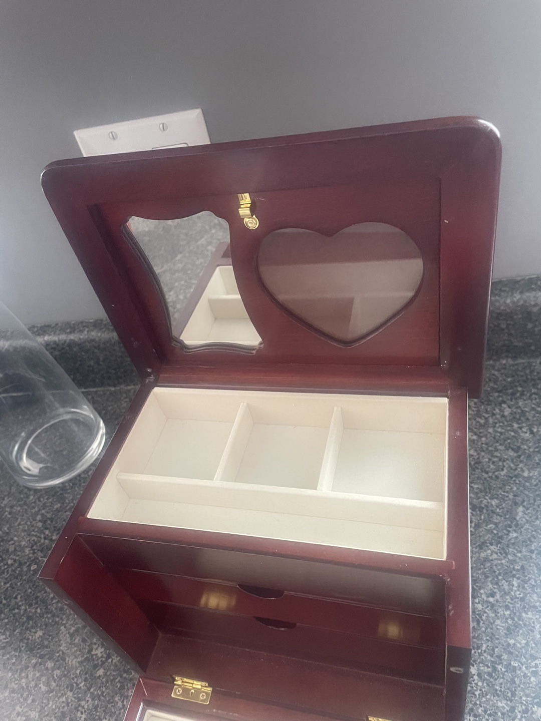 Here's a lovely wooden jewellery box! It has multiple drawers and compartments, perfect for organizing your rings, necklaces, and other treasures. The box is in great shape and has a beautiful floral design on the front. It also has small metal feet.