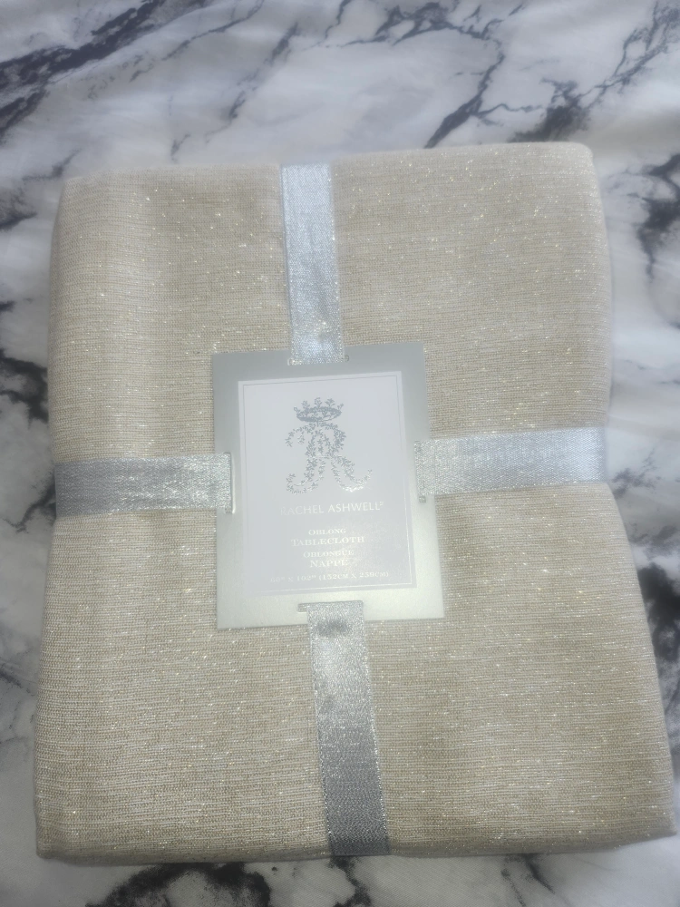 Selling a brand new Rachel Ashwell Shabby Chic Couture tablecloth! It's still in its original packaging. The tablecloth is a beautiful oatmeal colour with a subtle shimmer. It measures 60 x 102" (152cm x 259cm)