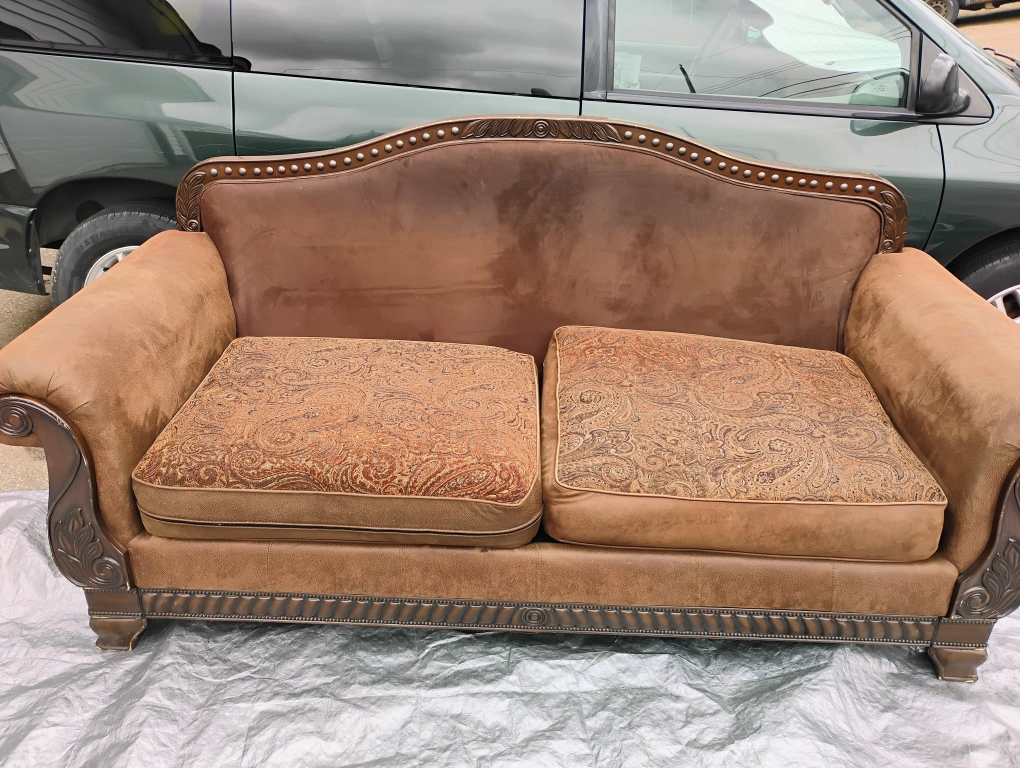 A cozy brown loveseat with patterned cushions. It has a classic design with detailed trim and comfortable seating. Perfect for a smaller space or as an accent piece in a living room