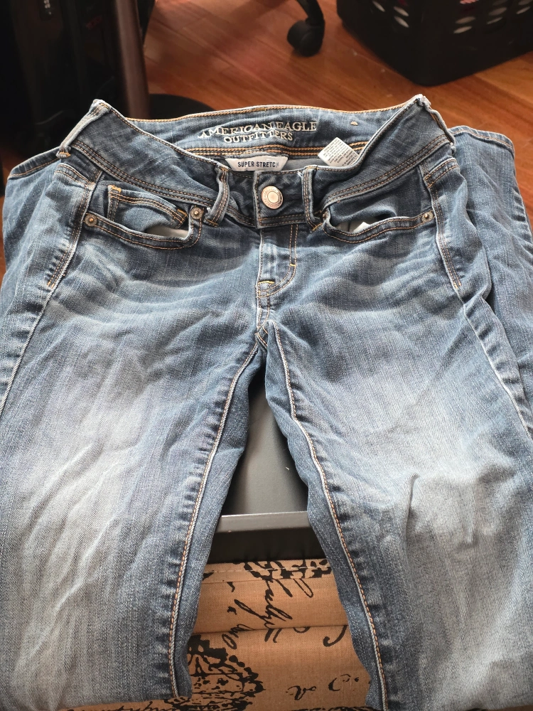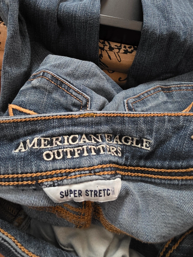 Selling a pair of American Eagle Outfitters Kick Boot jeans in size 0. They have a super stretch and are made of 72% cotton, 15% polyester, 12% viscose, and 1% elastane. Perfect for teens who are into thrifting and want unique wear patterns on their clothes.
