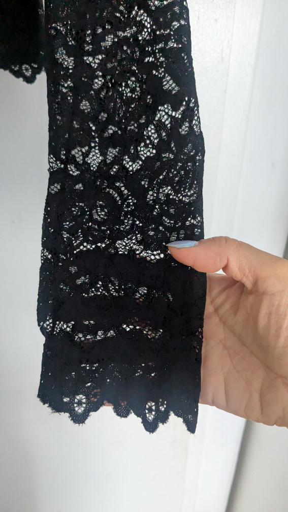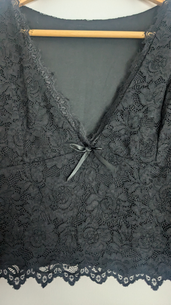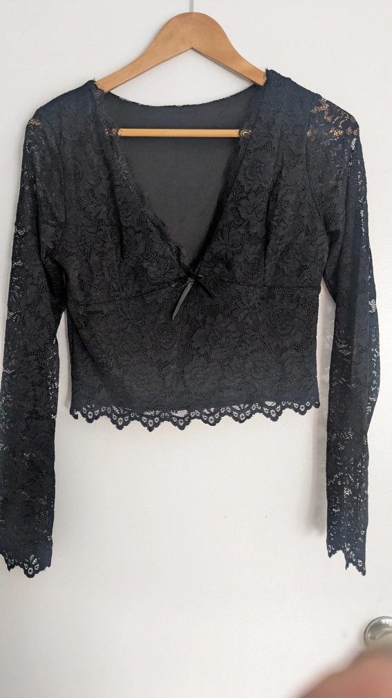 Selling a cute black lace long sleeve crop top. It's in great condition and features a V-neck and a small ribbon detail. Perfect for layering or wearing on its own!