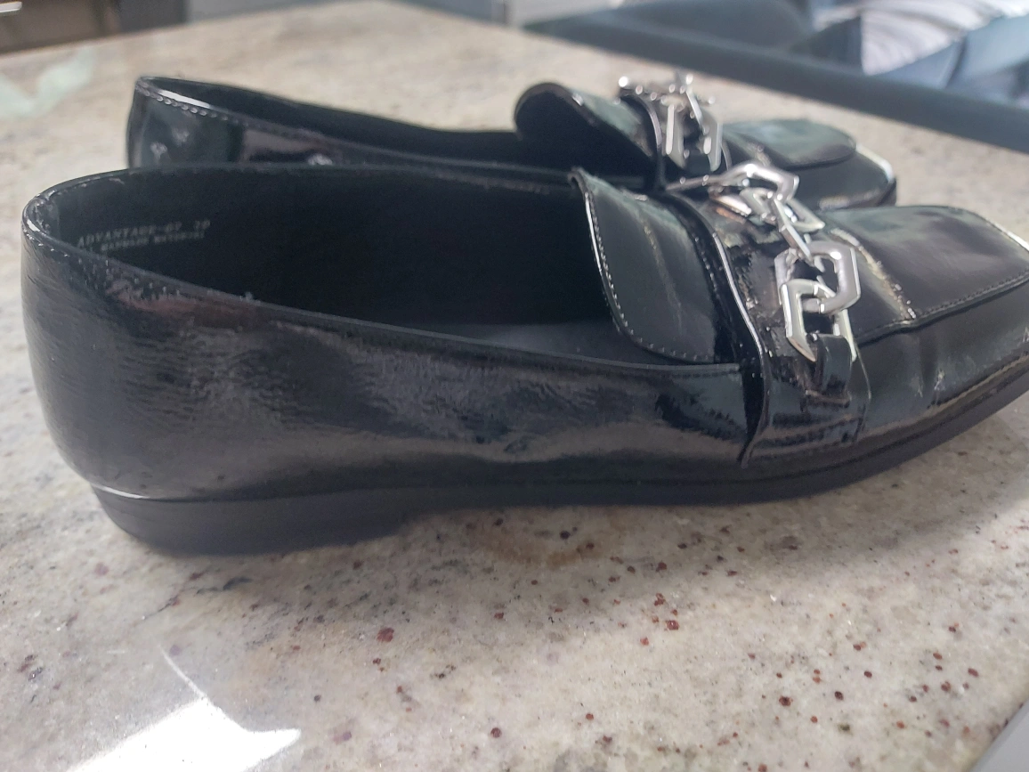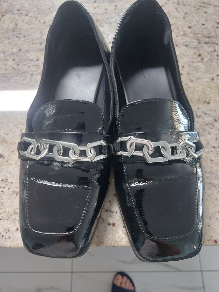 Selling a pair of Bamboo black patent leather loafers. They feature a stylish silver chain detail across the top. These are in great condition and are a size 10!