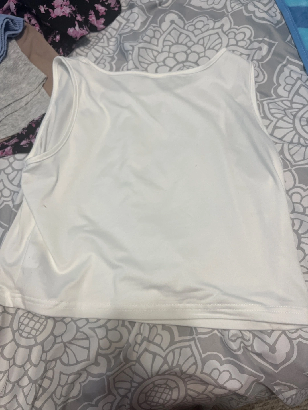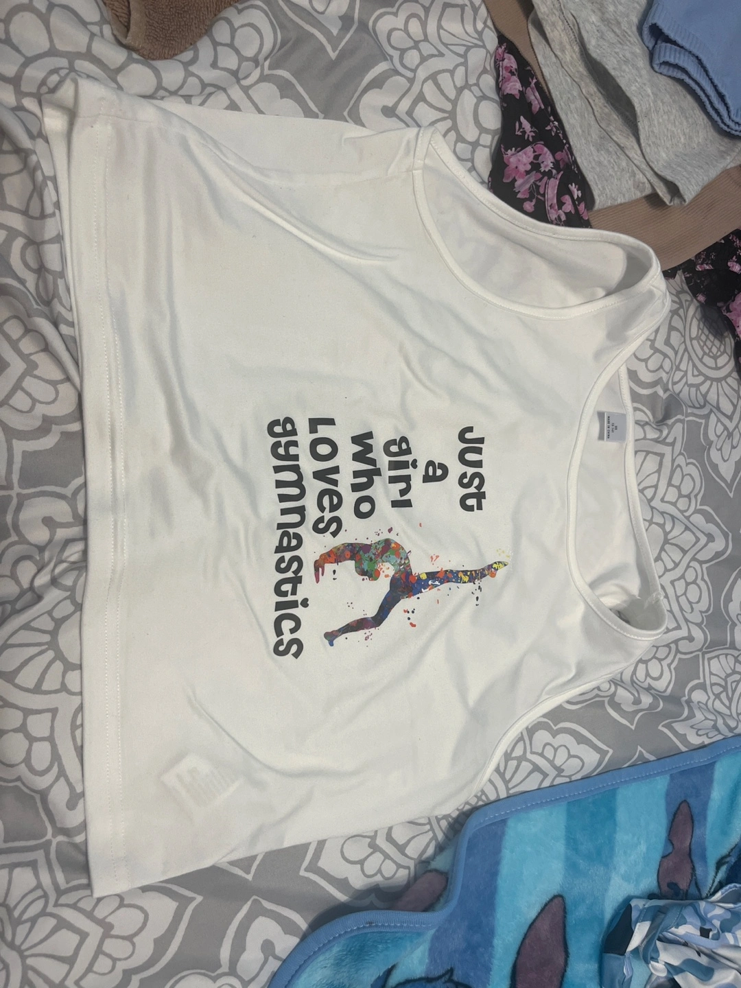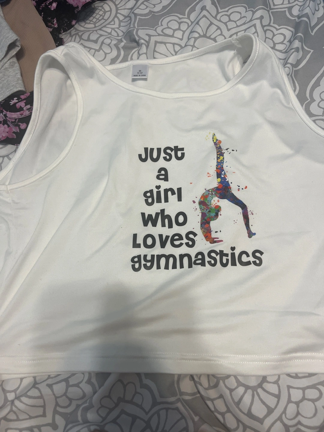 A cute white tank top for a girl who loves gymnastics! The shirt has a fun design with a gymnast. Size is US 13-14Y.