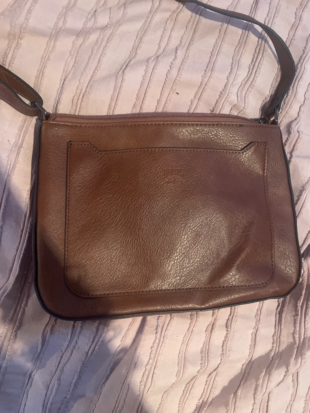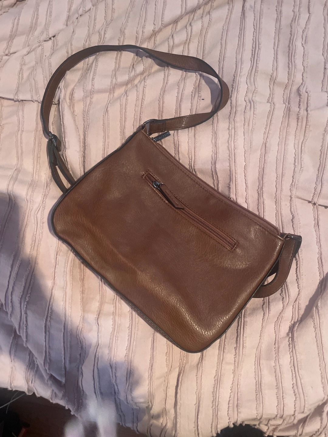 A never used brown Roots crossbody bag. medium size, good for everyday use. has adjustable straps and compartments.