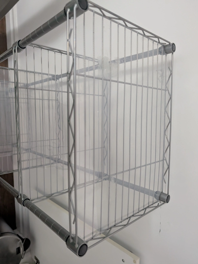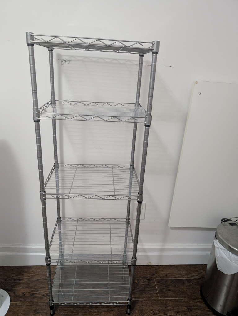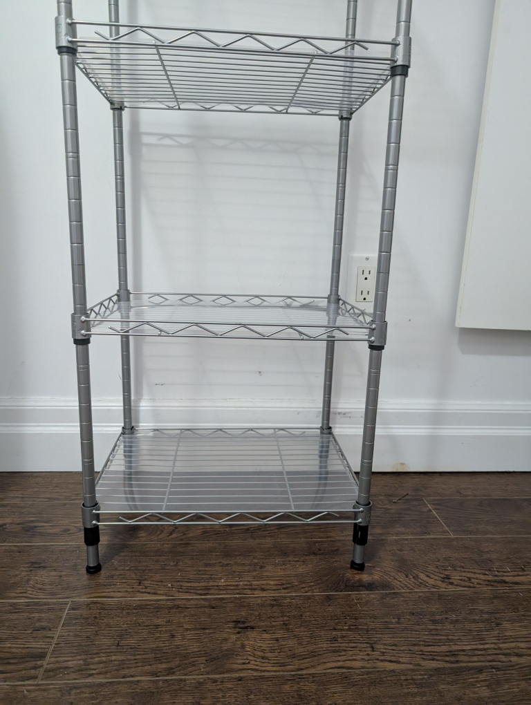 Selling a handy metal wire shelving unit! It's great for adding some extra storage space in a closet, pantry, or anywhere you need it. It's in good condition and the plastic inserts for each shelf are removable for easy cleaning.