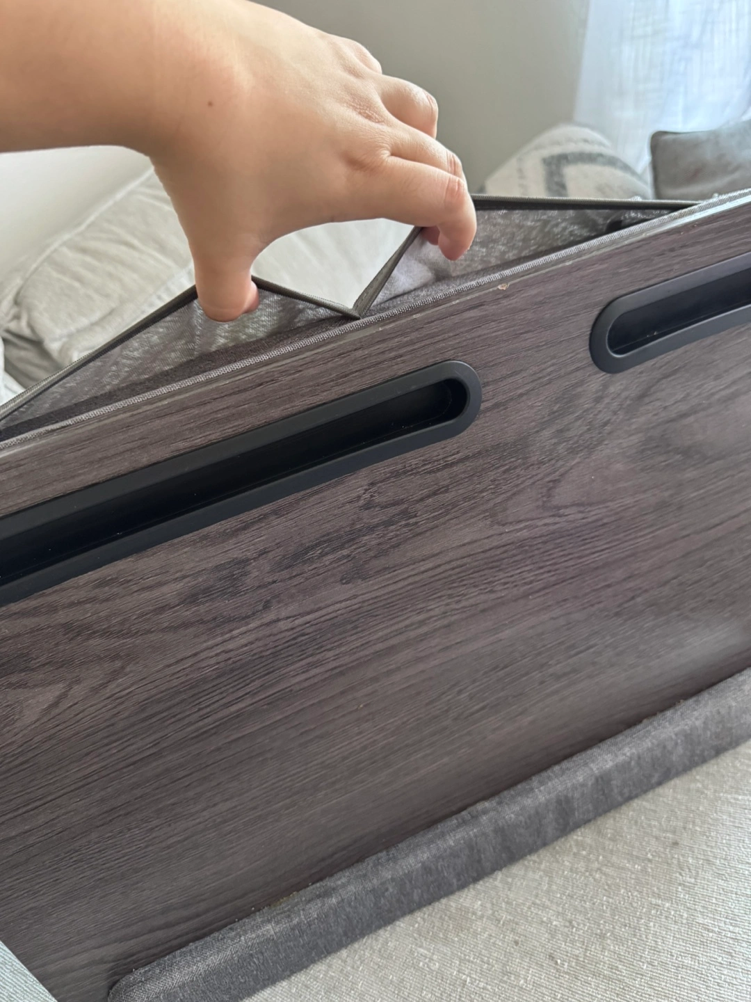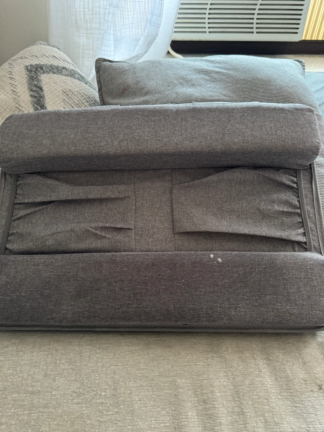 Selling a lap desk with a cushion base. It's in good condition and perfect for working or relaxing in bed or on the couch. Has tons of pockets (on the bottom and on top). There are some small marks, but otherwise it's in great shape!