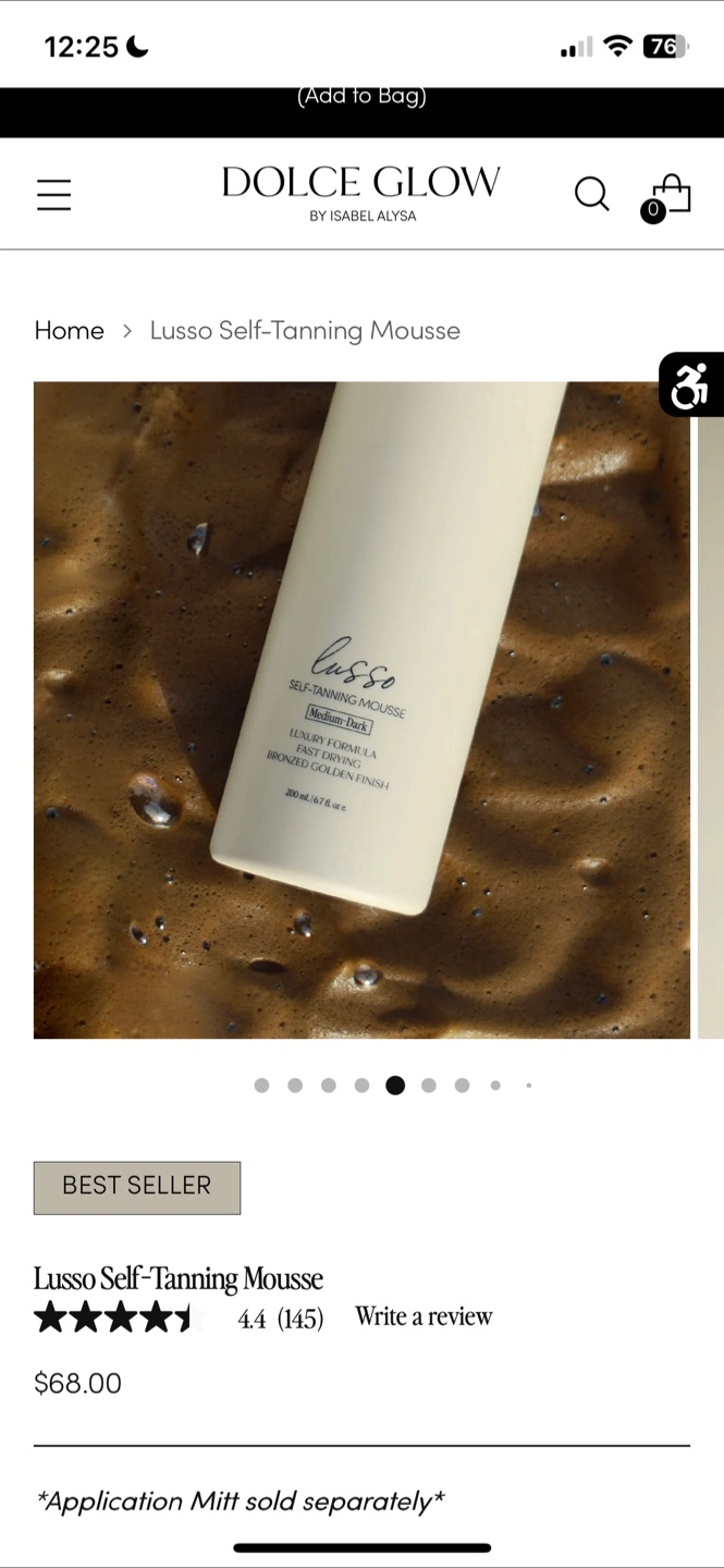 Selling a Dolce Glow Lusso Self-Tanning Mousse in Medium-Dark. It's a luxury formula for easy application and a bronzed golden finish. The bottle contains 200 ml / 6.7 fl oz. Retails for $68.
