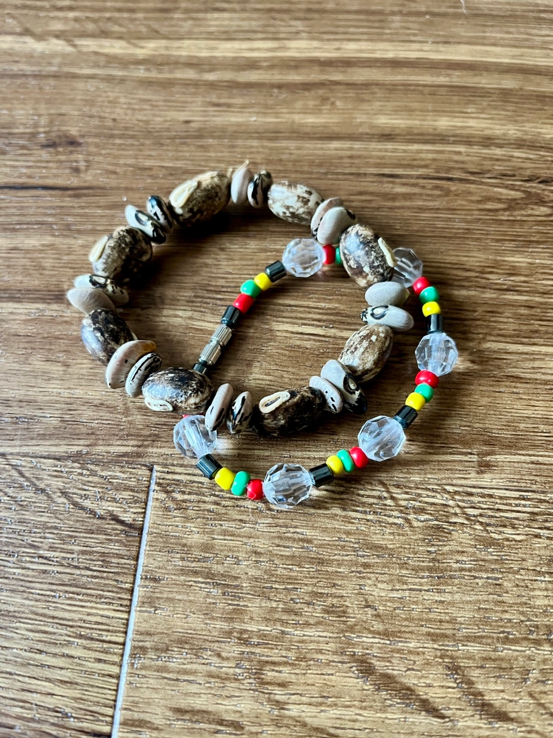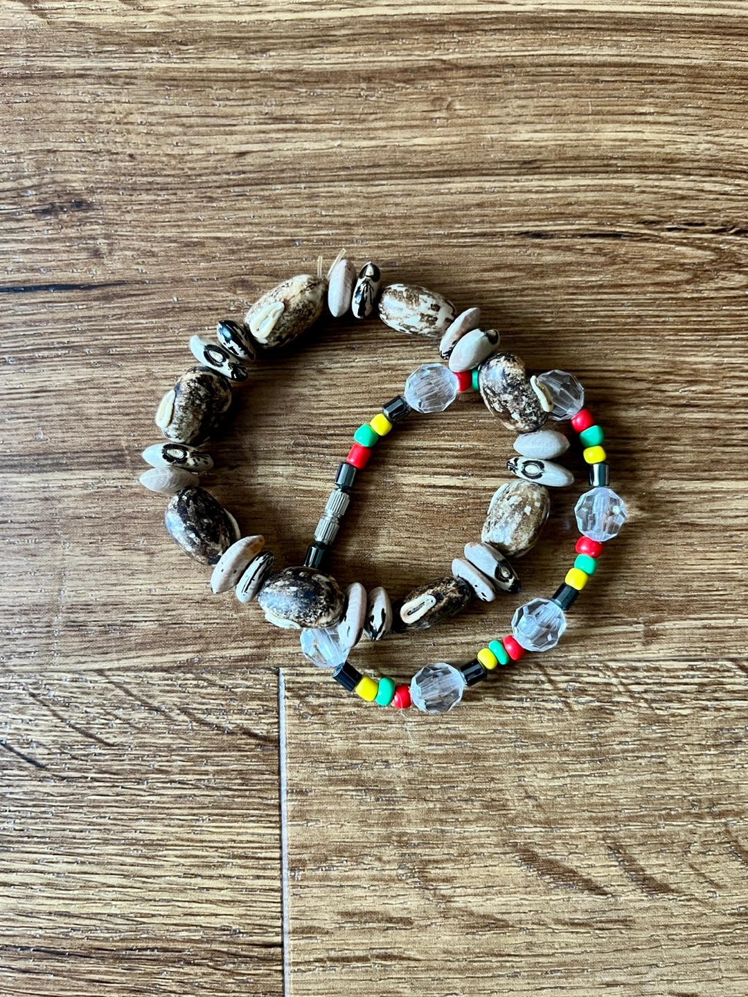 Set of two bracelets. One is made with natural seeds (elastic), and the other features colourful beads (not adjustable). A unique addition to your jewellery collection!