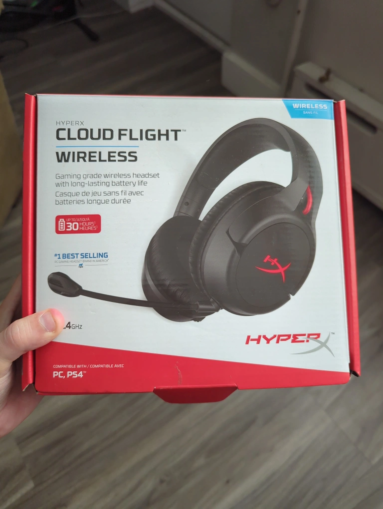 Selling a HyperX Cloud Flight wireless gaming headset in black. NEVER USED. IIt comes with the box and quick start guide. No issues, perfect condition.