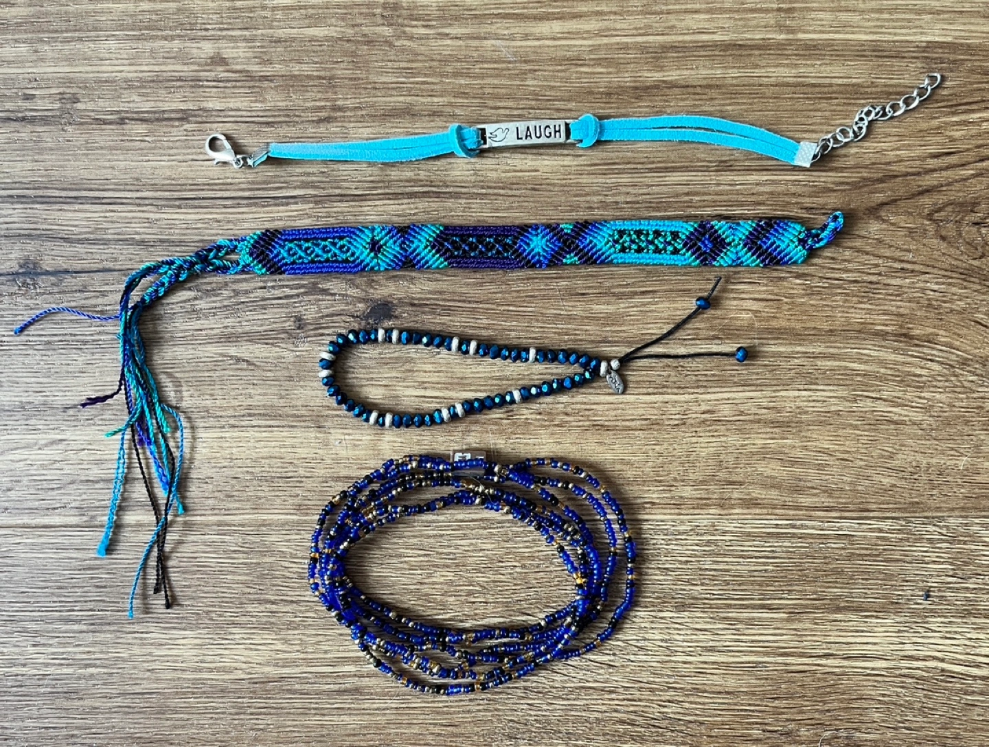 Selling bracelets in various shades of blue! There's a cute light blue suede bracelet with 'Laugh' on it, a woven bracelet with intricate patterns, and two beaded bracelets to complete the set. Three top ones have never been worn. Bottom worn has been worn but in good condition.