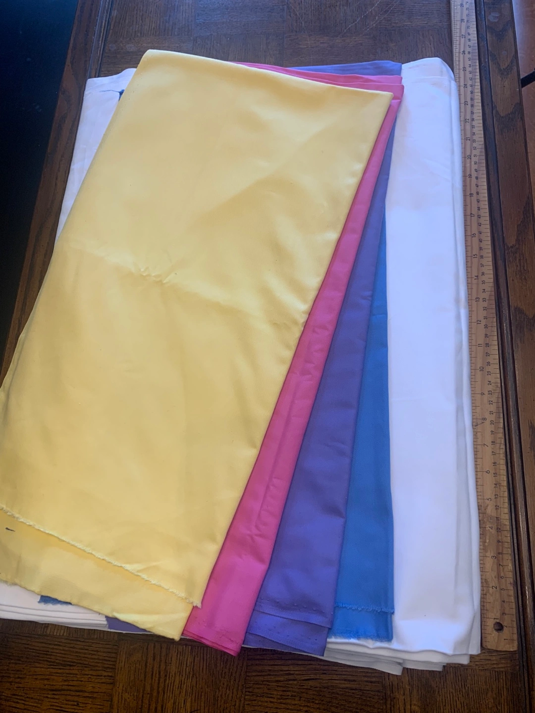 Selling 22 yards of 36” wide Polyester Twill fabric. Including a few fabric pieces in various colours including yellow, pink, blue, and white. Great for crafting or sewing projects! The 22 yards of white fabric is in 3 lengths, one piece is 9.5 yards, the second piece is 4.5 yards, and the third piece is 8 yards.