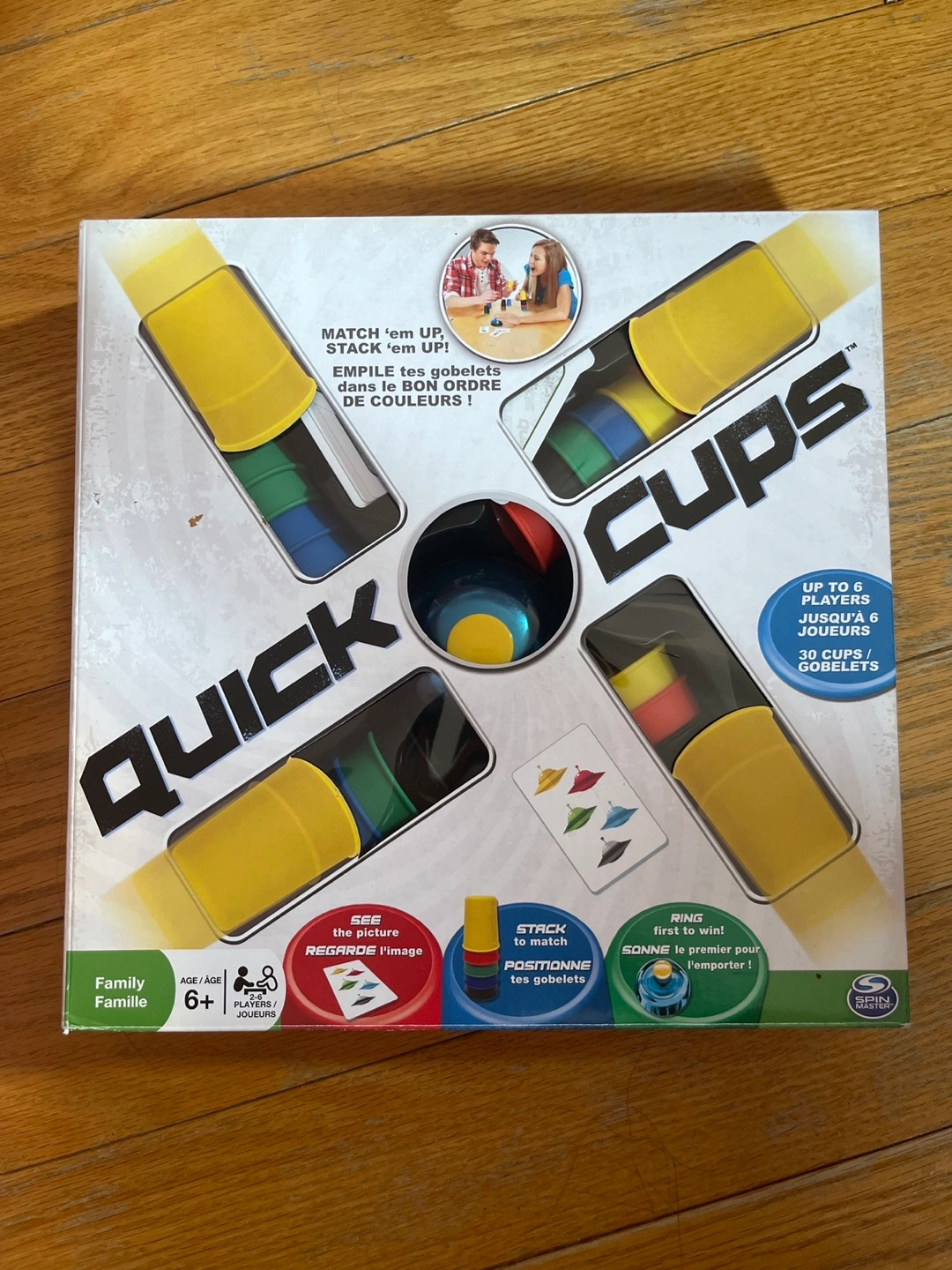 Selling the Quick Cups family game by Spin Master! This game is for ages 6+ and can be played with 2-6 players. It includes 30 cups and challenges you to stack them to match the picture. Ring first to win!