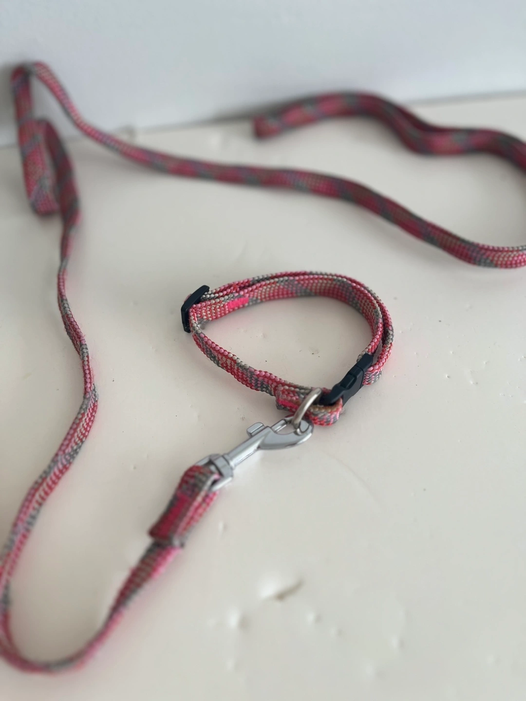 Selling a very small dog/puppy leash and collar set. The set is in good condition and features a unique woven design with pink, grey, and white colours. Pick up: Steveston North