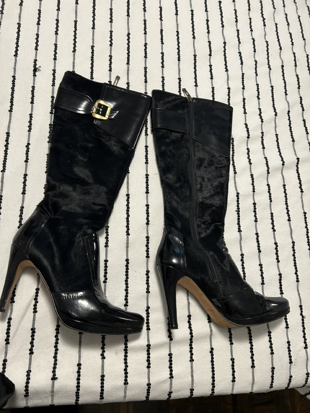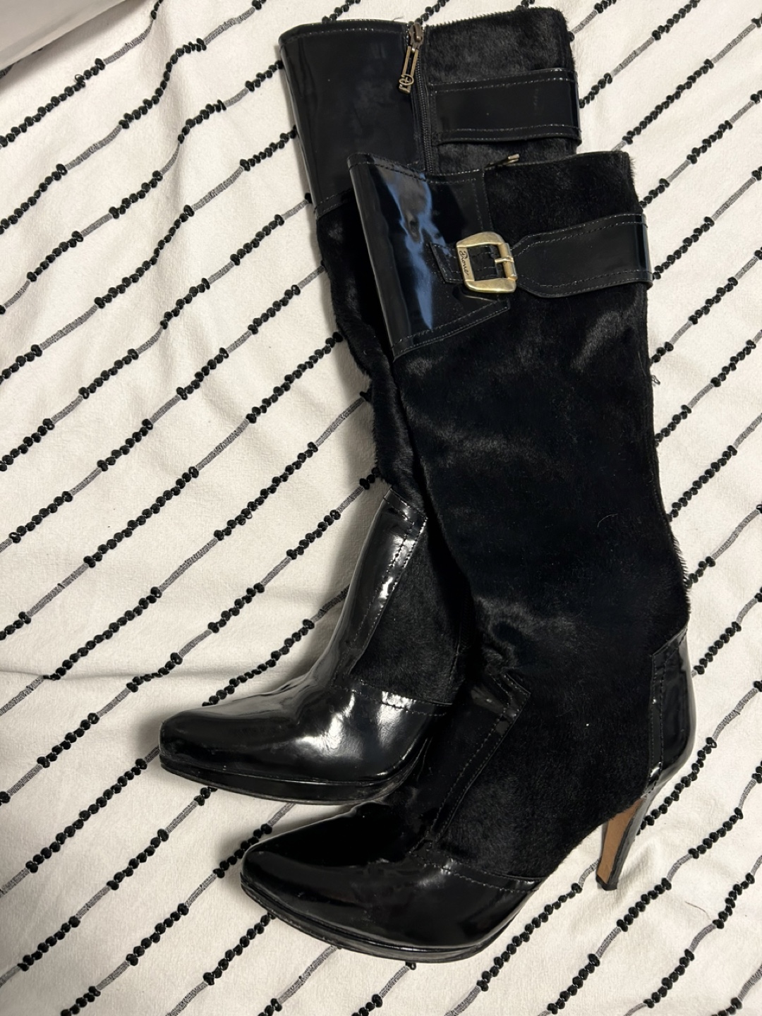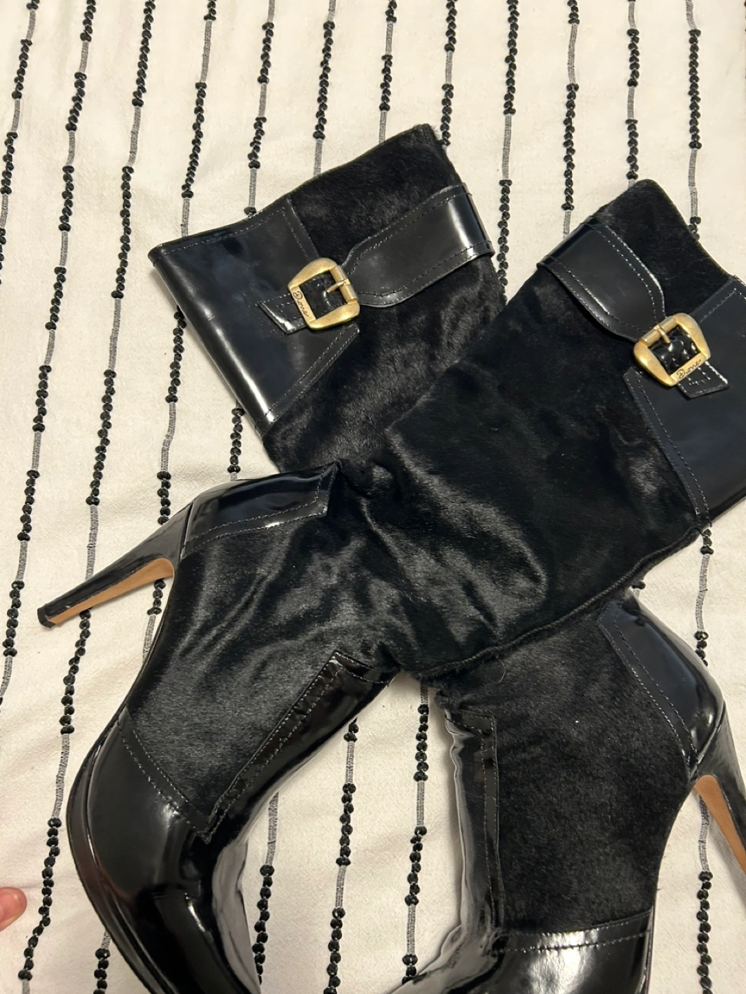 These are a pair of Dione high boots in black. They feature a leather and suede-like material with a gold buckle detail. Great for adding a touch of style to your outfits! I don't have the box or cases. I invite you to view my other items; If you are interested in any of them, I will give you a better price.