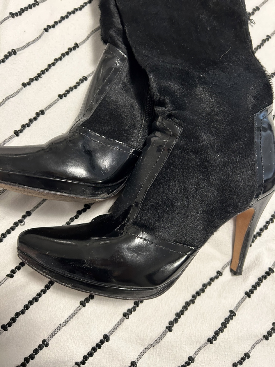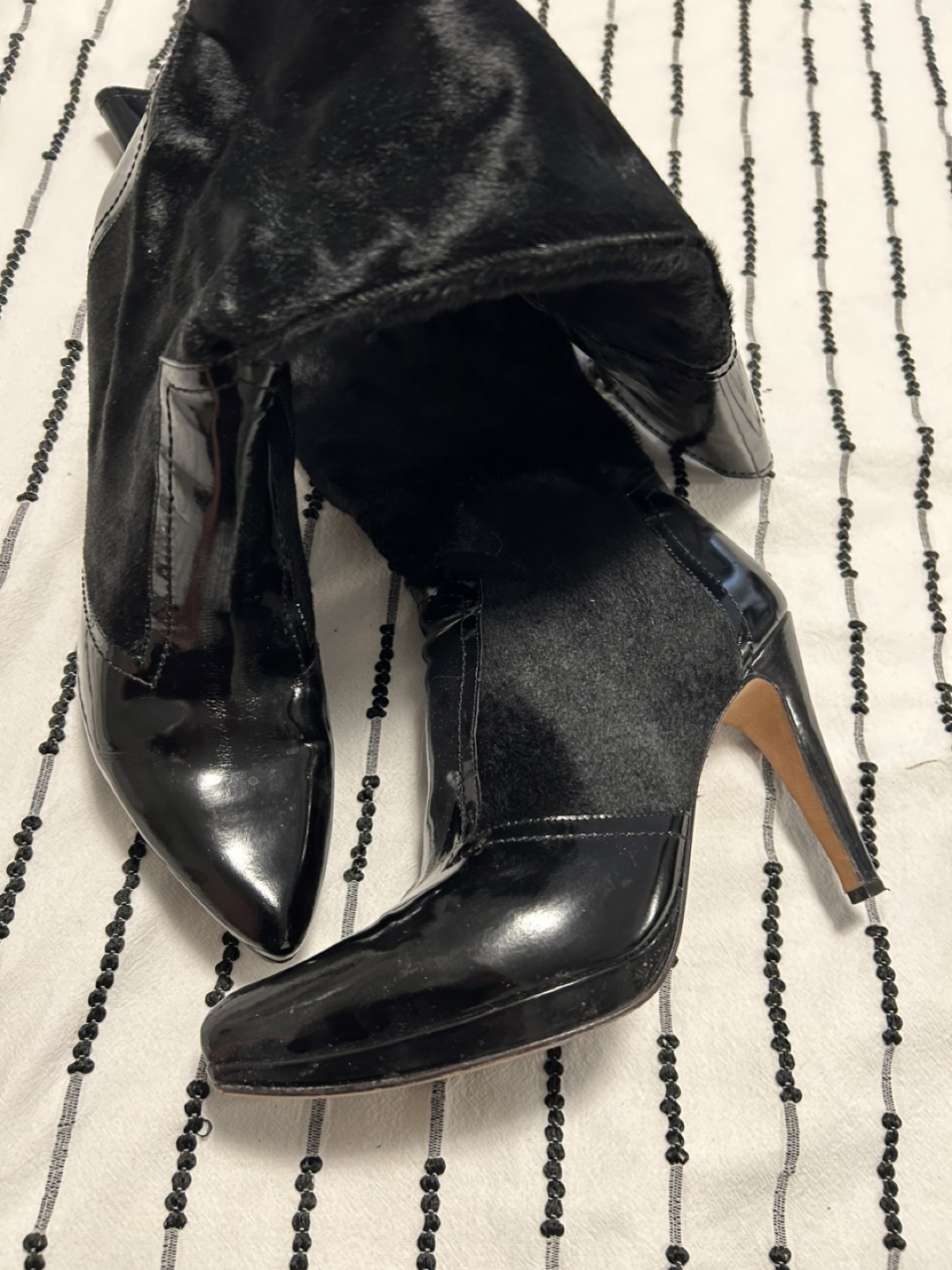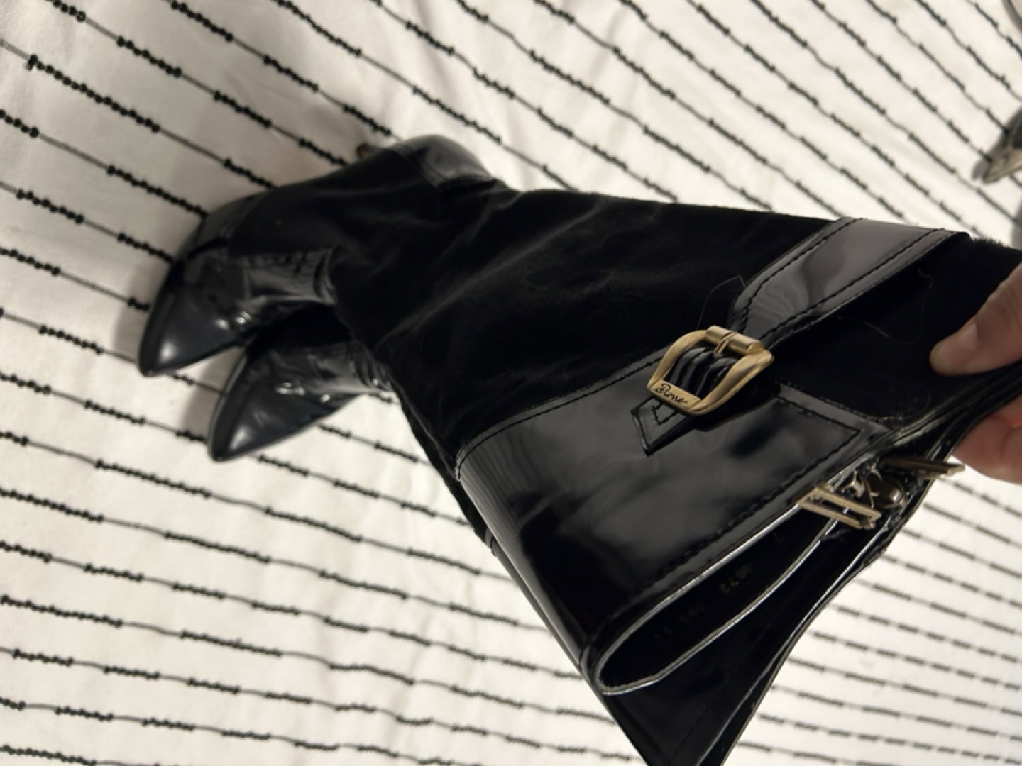 These are a pair of Dione high boots in black. They feature a leather and suede-like material with a gold buckle detail. Great for adding a touch of style to your outfits! I don't have the box or cases. I invite you to view my other items; If you are interested in any of them, I will give you a better price.