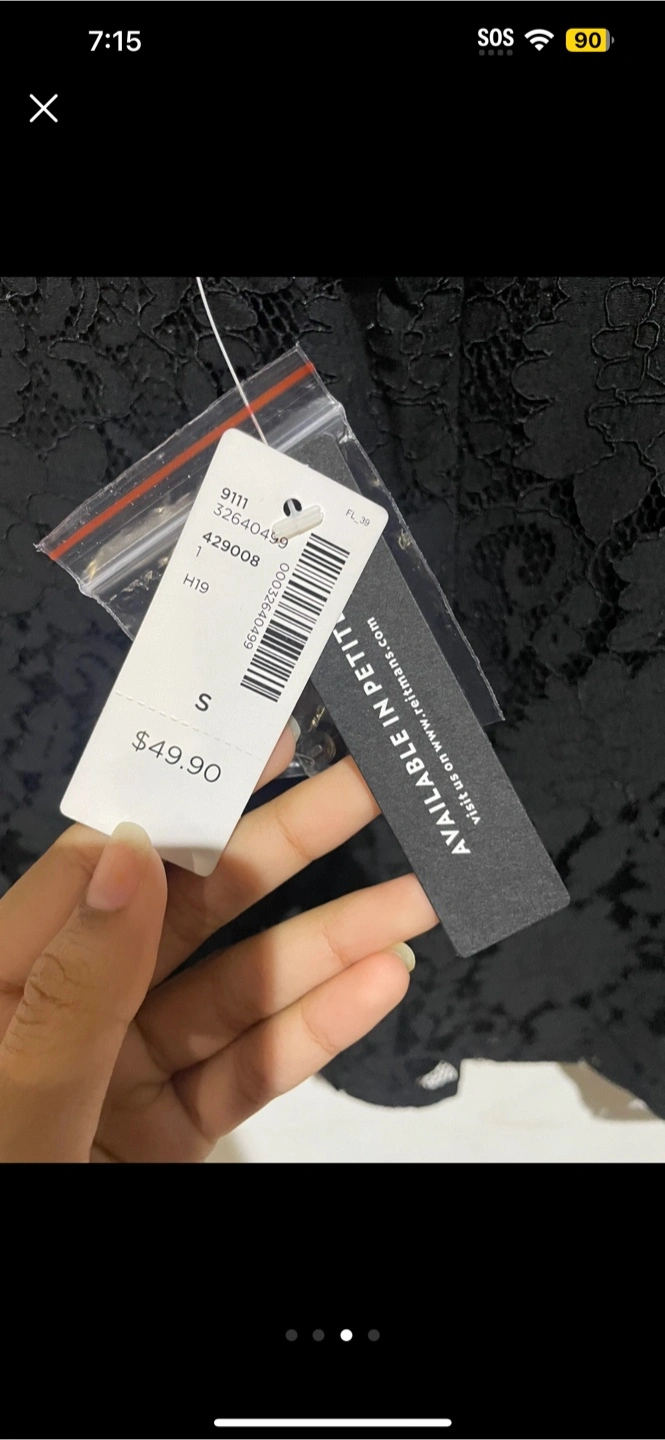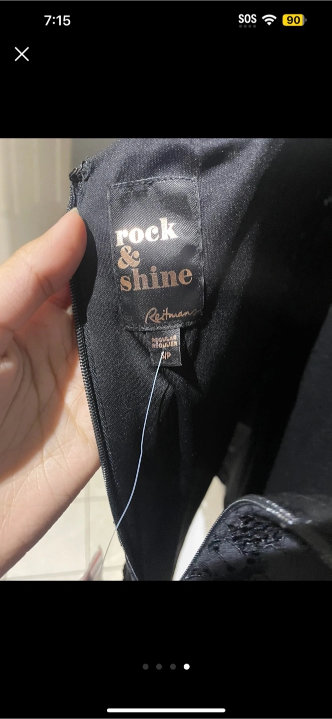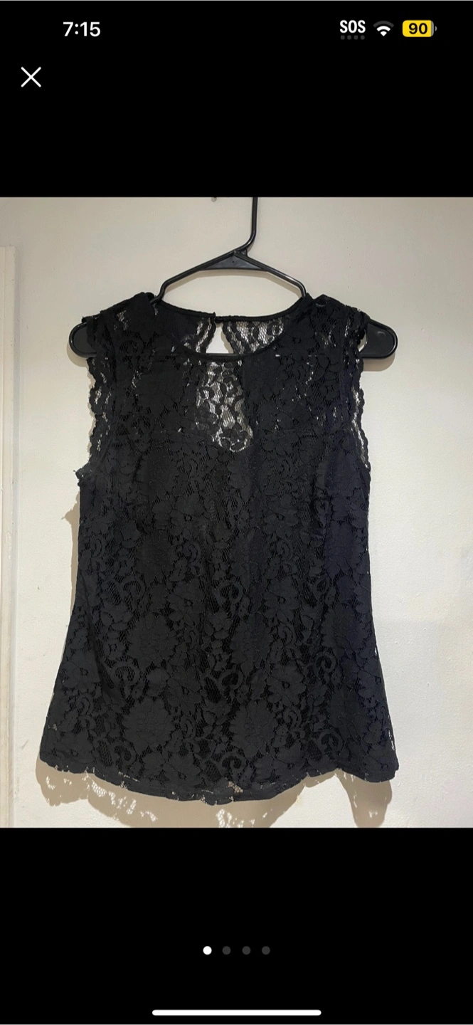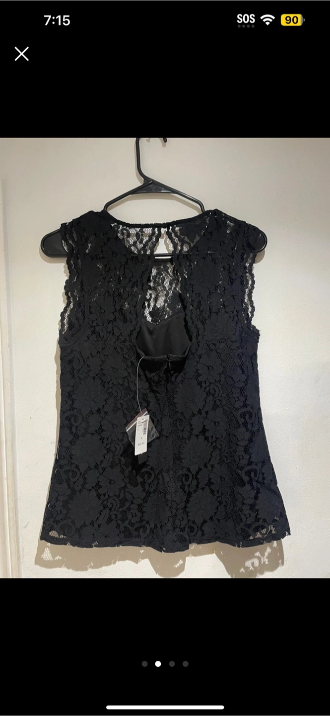 This is a Rock & Shine Reitmans top in size small. It's a beautiful black lace top that's perfect for dressing up or down. The original price tag shows it was $49.90. It's in great condition and ready for a new home!
