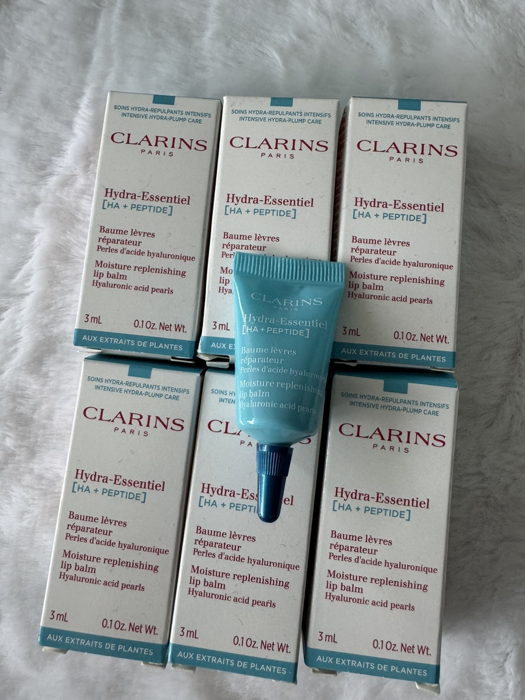 Selling multiple Clarins Hydra-Essentiel [HA + Peptide] lip balms! These are moisture replenishing lip balms with hyaluronic acid pearls. Each one is 3ml/0.1 Oz. Net Wt.
