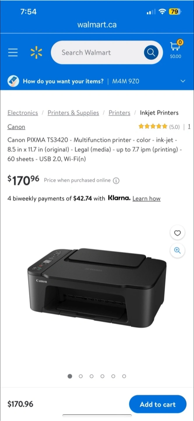 Selling a Canon PIXMA TS3420 printer in black! It's a wireless printer that can print, copy, and scan. It can handle paper sizes of 8.5 x 11.7 inches (original) and Legal (media), printing up to 7.7 ipm. It supports USB 2.0 and Wi-Fi(n) connectivity